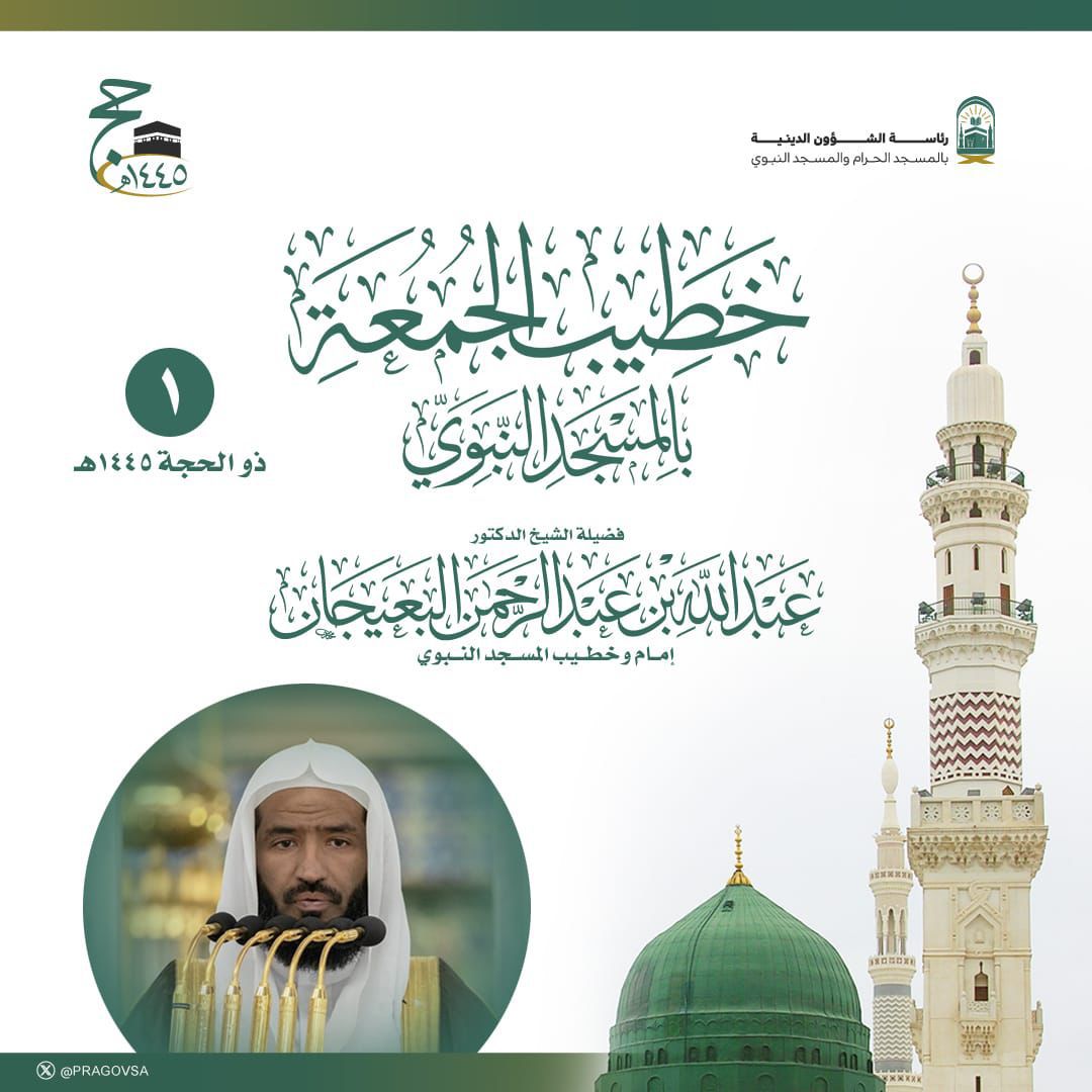 سيكون خطيب الجمعة بالمسجد النبوي ، فضيلة الشيخ الدكتور عبدالله البعيجان.