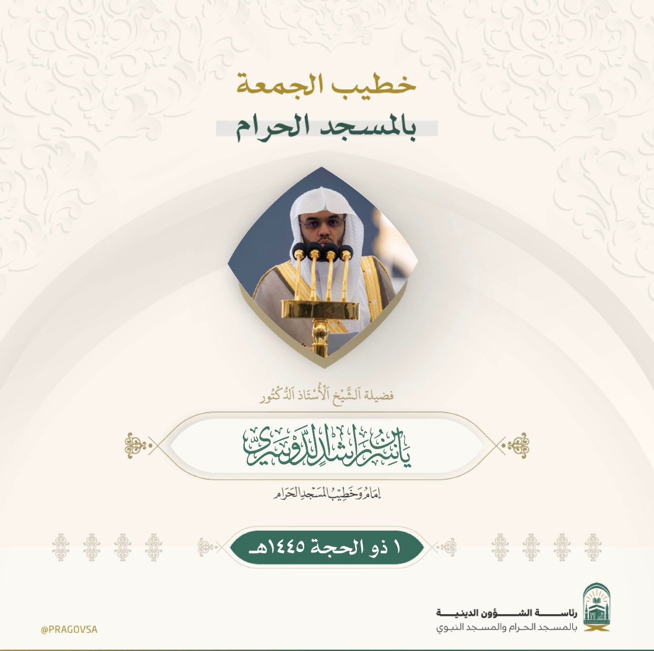 سيكون خطيب الجمعة بالمسجد الحرام ، فضيلة الشيخ أ.د ياسر الدوسري.