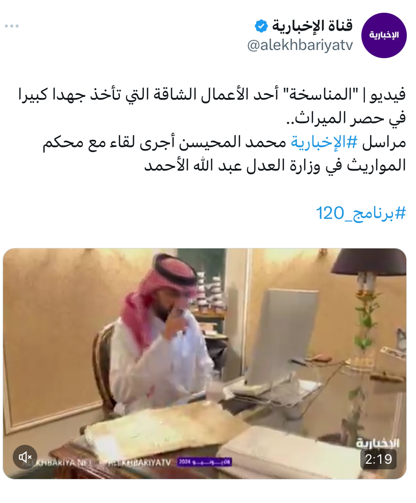 أوضح مُحَكّم المواريث في وزارة العدل عبدالله الأحمد، أن “المناسخة” أحد الأعمال الشاقة التي تأخذ جهدًا كبيرًا في حصر الميراث.
