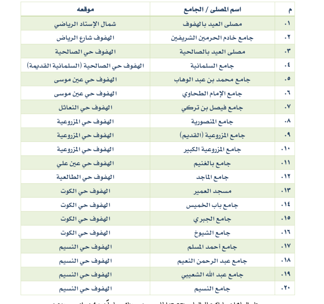حيث أعلن الفرع عن الانتهاء من تجهيز وإعداد عدد من المصليات والجوامع بمحافظة الأحساء، بلغ عددهم 242 مسجدًا ومصلى، من أجل أداء صلاة عيد الاضحى المبارك.