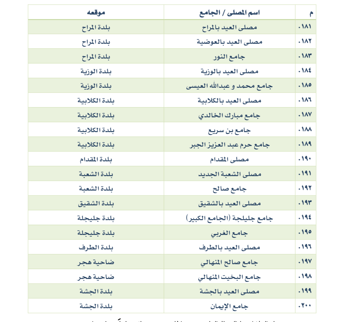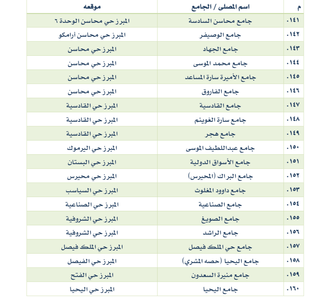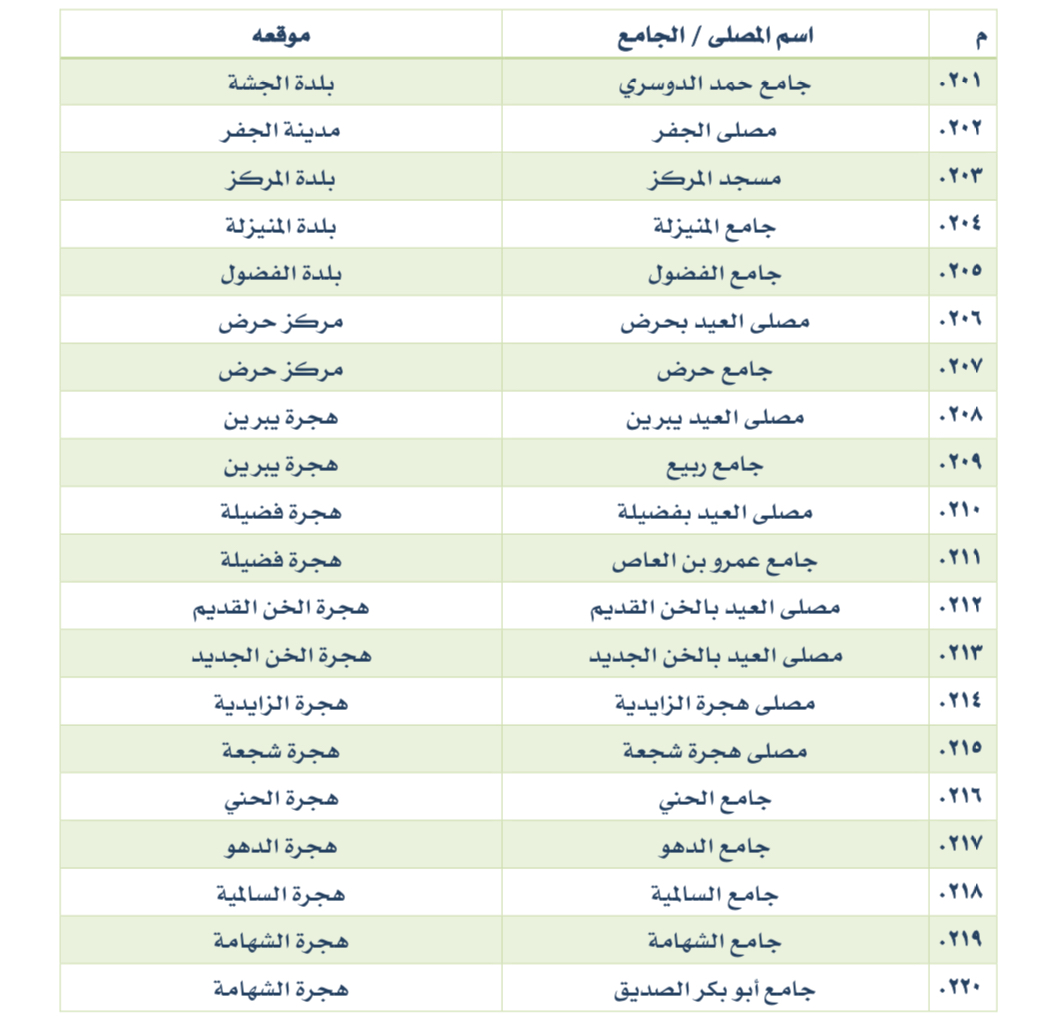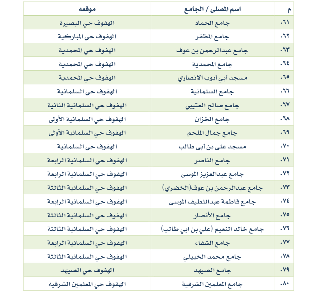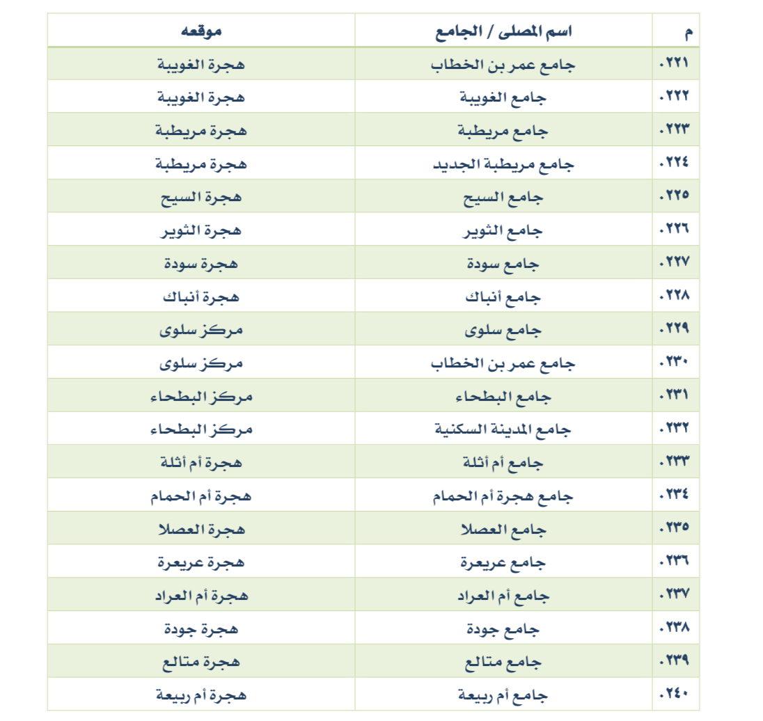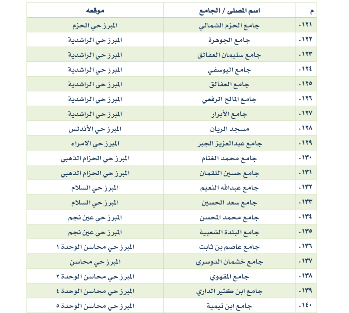 وجاءت أسماء المصليات والمساجد كالتالي: