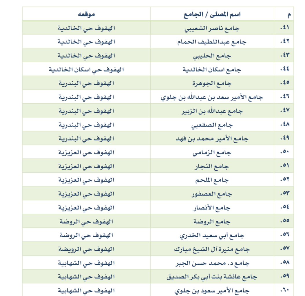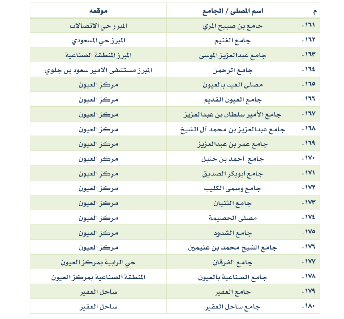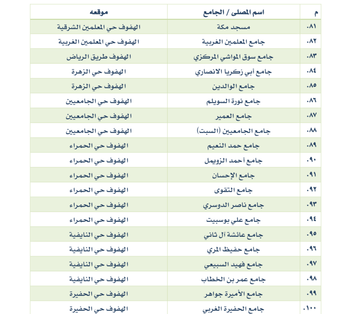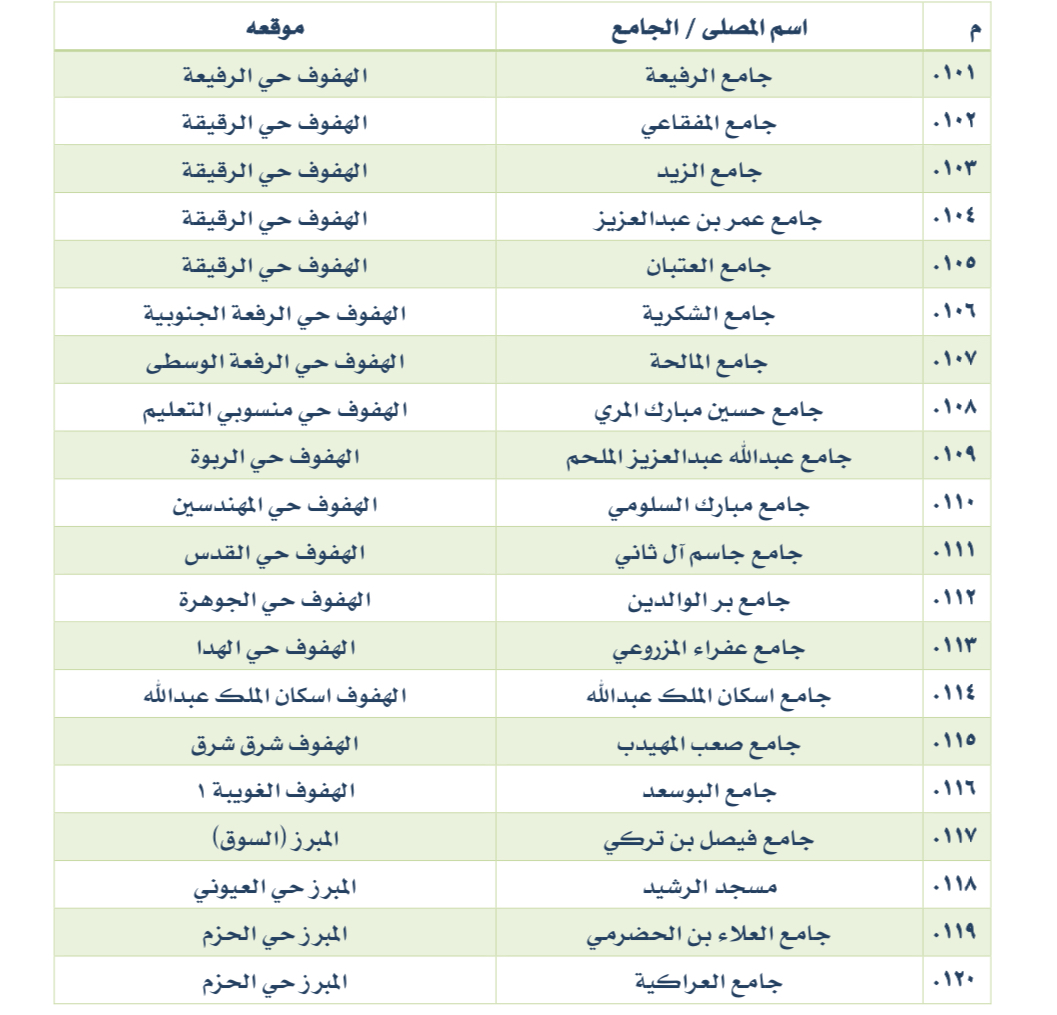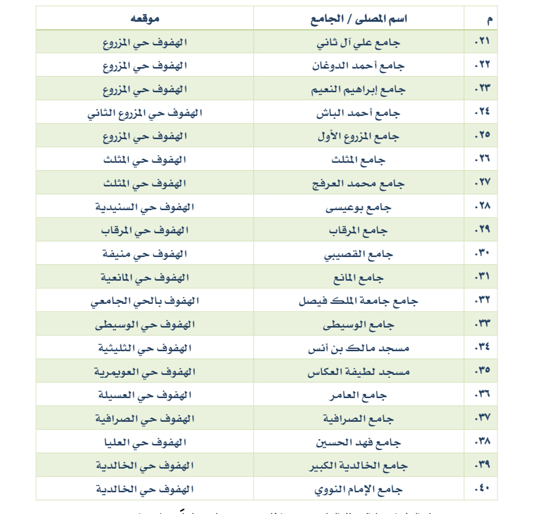 وجاءت أسماء المصليات والمساجد كالتالي: