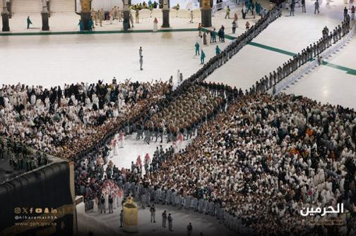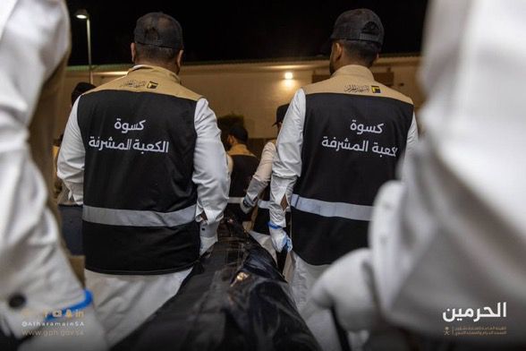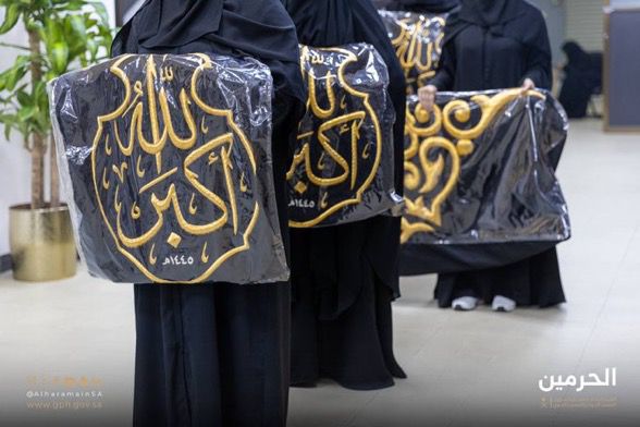 مراسم تغيير كسوة الكعبة المشرفة تبدأ من حمل الكسوة من مجمع الملك عبدالعزيز لصناعة كسوة الكعبة المشرفة وفق تنظيم محدد ثم إدخالها إلى شاحنة النقل حتى وصولها للمسجد الحرام.