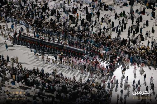 نقل كسوة الكعبة المشرفة عبر مقطورة طولها 13 مترًا إلى داخل المسجد الحرام وصولًا لصحن المطاف ، ويبلغ مقدار وزن الكسوة 1350 كيلو جرام.