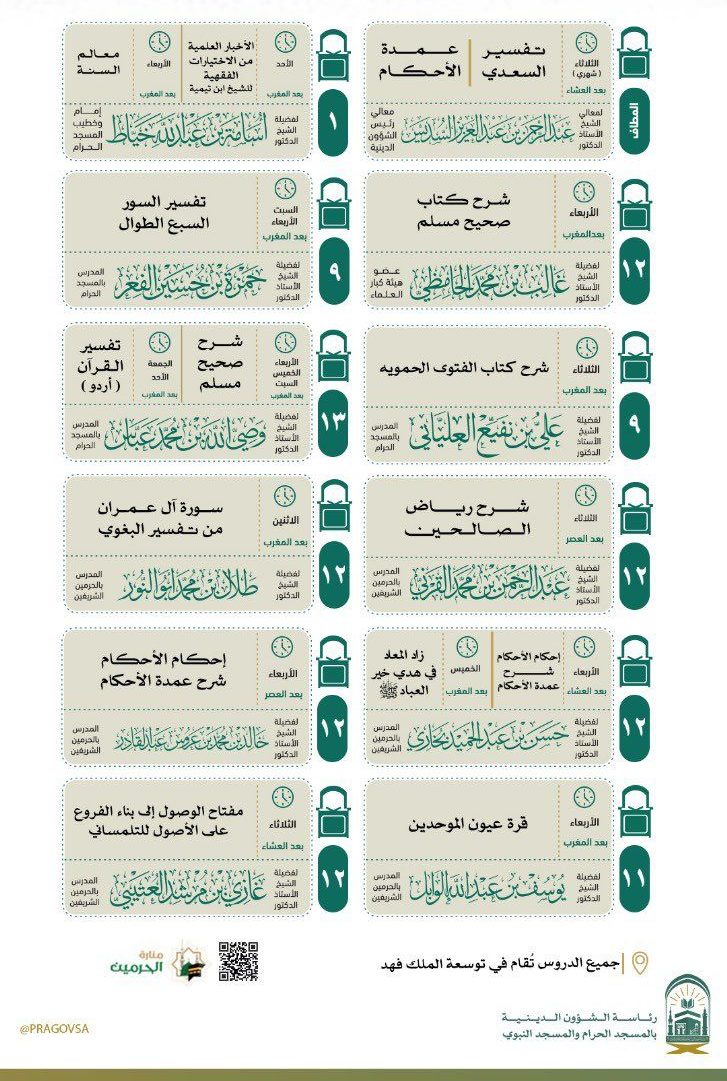 ‏اعلنت رئاسة الشؤون الدينية بالمسجد الحرام والمسجد النبوي ، عن البرنامج العلمي الدائم بالمسجد الحرام لشهر محرم ١٤٤٦هـ حسب الجدول التالي :