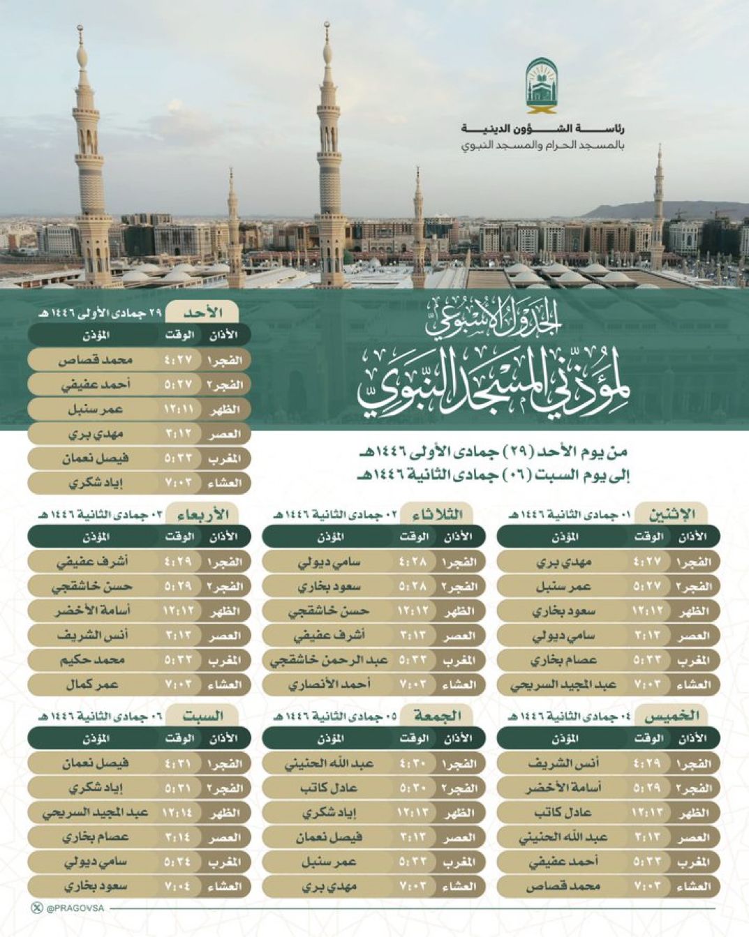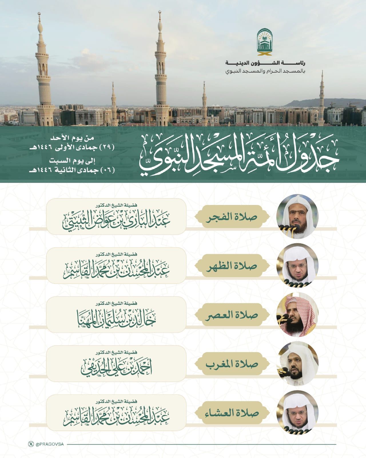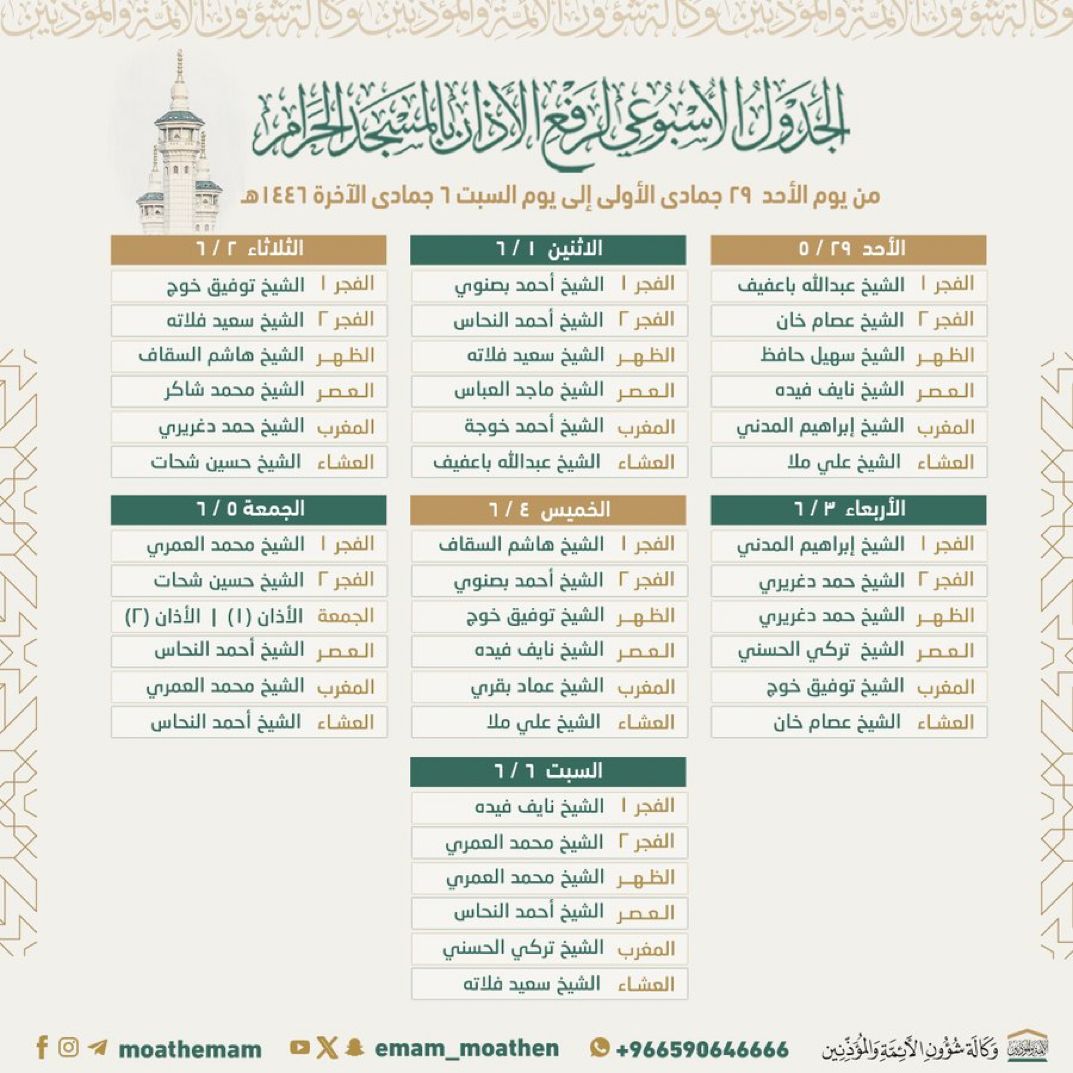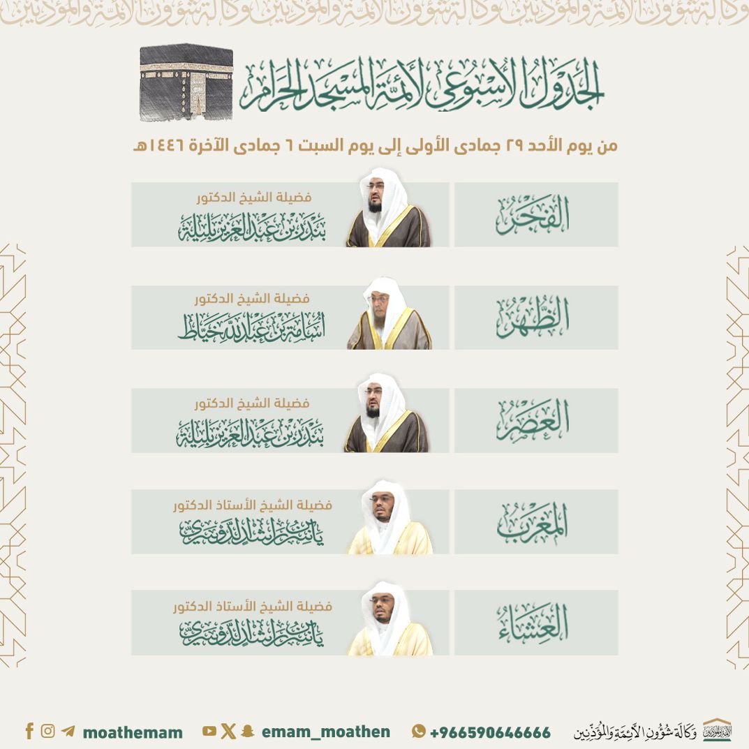 أصدرت رئاسة الشؤون الدينية للمسجد الحرام والمسجد النبوي الجدول الأسبوعي لأئمة المسجد الحرام والمسجد النبوي اعتباراً من يوم الأحد 29 جمادى الأولى إلى يوم السبت 6 جمادى الثانية 1446هـ.