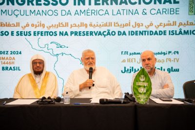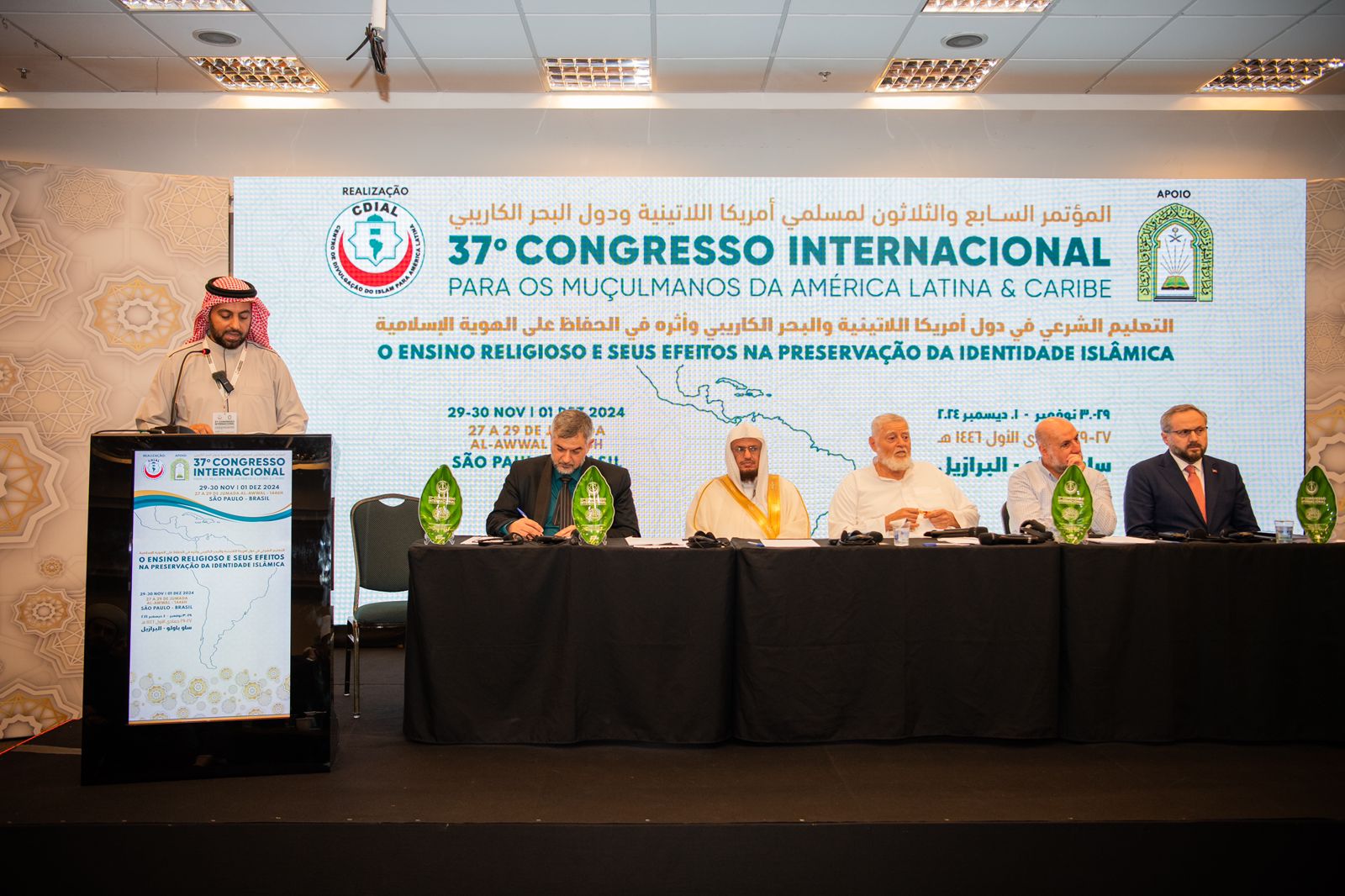 اختتمت مساء امس الأحد التاسع والعشرين من شهر جمادى الأولى 1446 أعمال المؤتمر السنوي الـ 37 لمسلمي أمريكا اللاتينية ودول البحر الكاريبي، الذي نظمه مركز الدعوة الإسلامية بالبرازيل بالتعاون مع وزارة الشؤون الإسلامية والدعوة والإرشاد بعنوان: (التعليم الشرعي في دول أمريكا اللاتينية والبحر الكاريبي وأثره في الحفاظ على الهوية) ،خلال الفترة 29-30 نوفمبر والأول من ديسمبر 2024م في مدينة ساوباولو البرازيلية، بمشاركة أكثر من 120 شخصية من العلماء والدعاة والأكاديميين وطلبة العلم من أكثر من 30 دولة من أمريكا اللاتينية والبحر الكاريبي ، ودول عربية وإسلامية