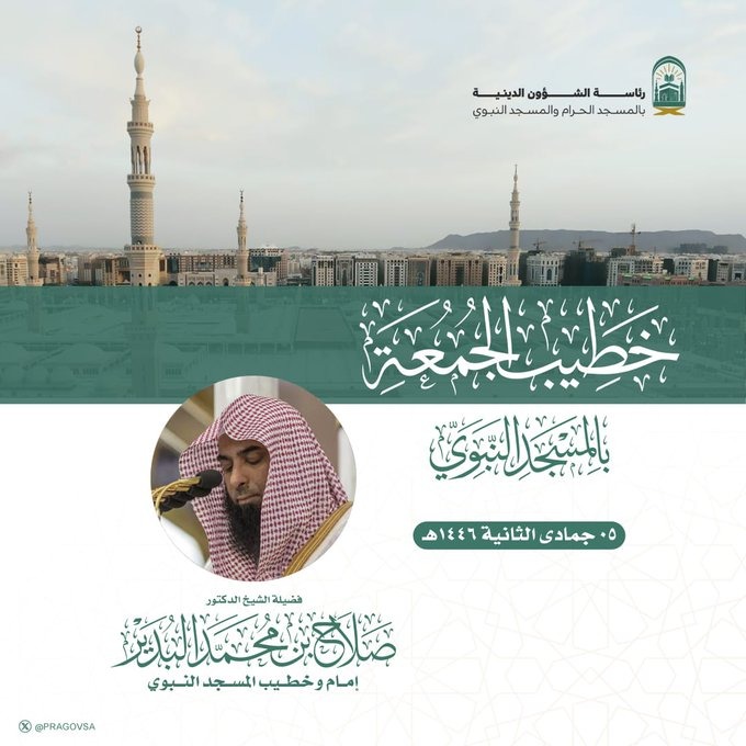 سيكون إمام وخطيب الجمعة بالمسجد  النبوي ، ‏فضيلة الشيخ الدكتور  / صلاح بن محمد البدير.
