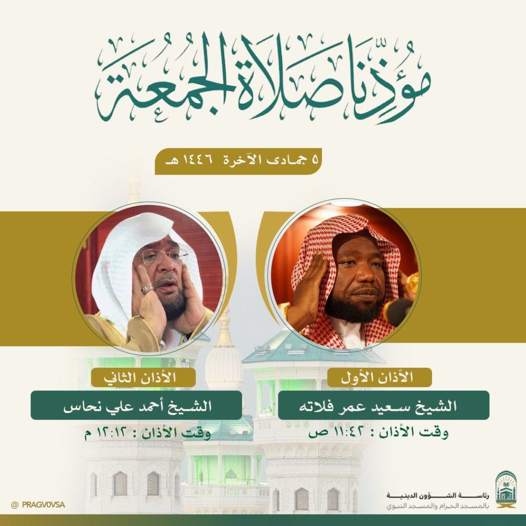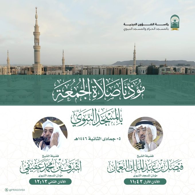 أعلنت رئاسة الشؤون الدينية بالمسجد الحرام والمسجد النبوي ، عن أسماء خطيبي ومؤذني صلاة الجمعة  ليوم غداً  5 جمادى الثاني 1446هـ بالمسجد الحرام والمسجد النبوي.