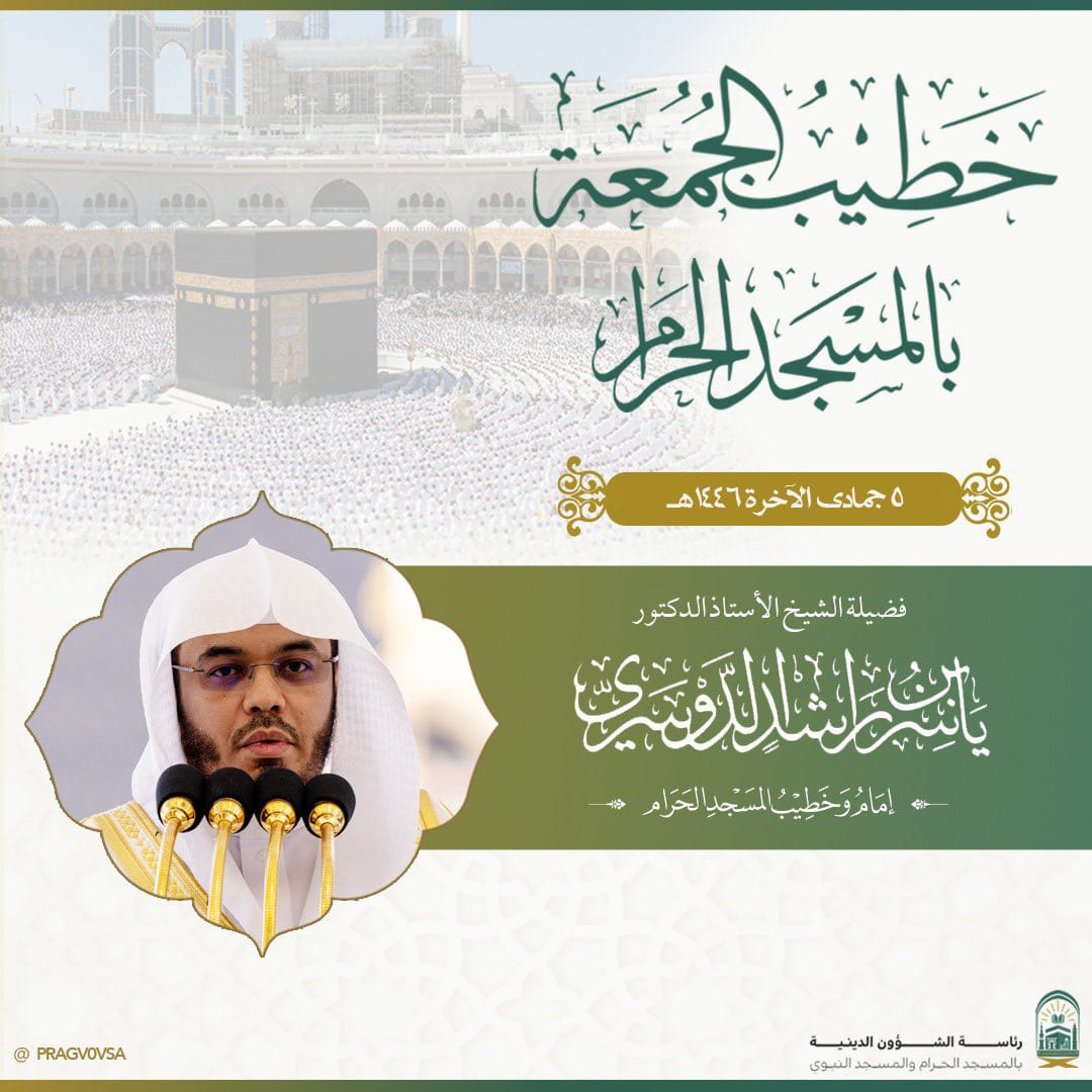 سيكون إمام وخطيب الجمعة بالمسجد الحرام ، فضيلة الشيخ  الأستاذ  الدكتور /  ياسر بن راشد الدوسري  .