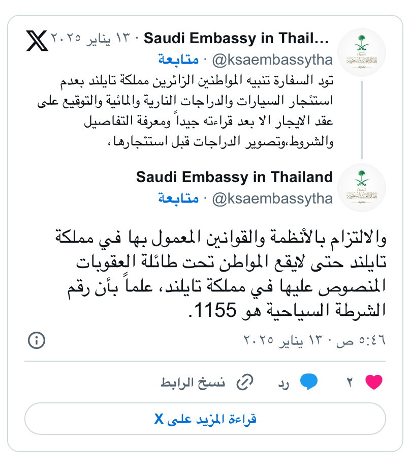 حذّرت السفارة السعودية في تايلند، المواطنين السعوديين من استئجار السيارات والدرّاجات النارية والمائية دون قراءة شروط وأحكام الإيجار بعناية.