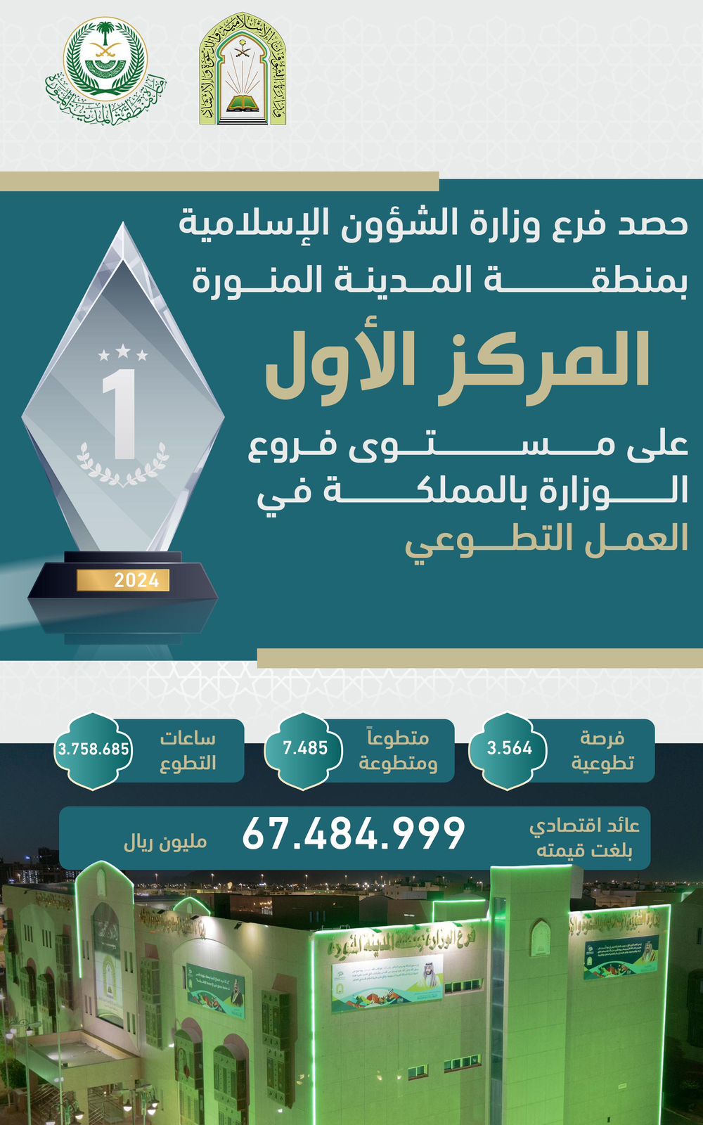 حصد فرع وزارة الشؤون الإسلامية والدعوة والإرشاد بمنطقة المدينة المنورة المركز الأول على مستوى فروع الوزارة بالمملكة للعام 2024 في مخرجات العمل التطوعي ، حيث طرح الفرع بمنطقة المدينة المنورة 3564 فرصة تطوعية قدم من خلالها 3758685 ألف ساعة تطوعية وعمل بها 7485 متطوعاً ومتطوعة وبعائد اقتصادي بلغت قيمته 67484999 ريال .