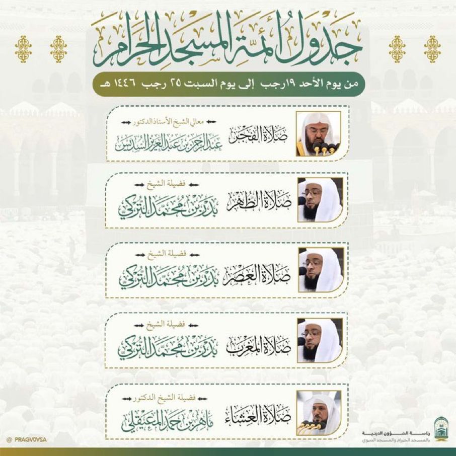 اعتمدت رئاسة الشؤون الدينية بالمسجد الحرام والمسجد النبوي الجدول الأسبوعي لأصحاب الفضيلة أئمة الحرمين الشريفين للفترة من يوم الأحد 19 رجب إلى يوم السبت 25 رجب 1446هـ. ويتضمن جدول أئمة المسجد الحرام لصلاة الفجر معالي الشيخ الدكتور عبدالرحمن السديس، وصلاة الظهر والعصر والمغرب فضيلة الشيخ بدر التركي، فيما يؤم فضيلة الشيخ الدكتور ماهر المعيقلي المصلين لصلاة العشاء.