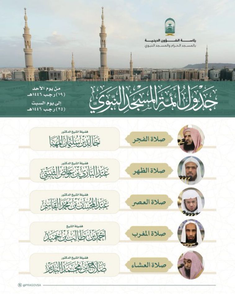 أما بالنسبة لجدول أئمة المسجد النبوي، فسيؤم المصلين في صلاة الفجر فضيلة الشيخ الدكتور خالد المهنا، وصلاة الظهر فضيلة الشيخ الدكتور عبدالباري الثبيتي، وصلاة العصر فضيلة الشيخ الدكتور عبدالمحسن القاسم، وصلاة المغرب فضيلة الشيخ الدكتور أحمد بن حميد، فيما يؤم المصلين في صلاة العشاء فضيلة الشيخ الدكتور صلاح البدير.