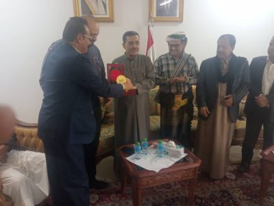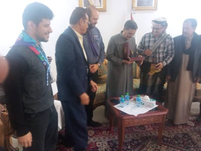 استقبل الدكتور علي منصور بن سفاع سفير الجمهورية اليمنية في الكويت الوفد اليمني المشارك بالملتقي الكشفي الدولي الثالث لتمكين الشباب بالكويت برئاسة القائد مشعل بن سيف جيوب الداعري المفوض العام للكشافة اليمنية عضو اللجنة الكشفية العربية