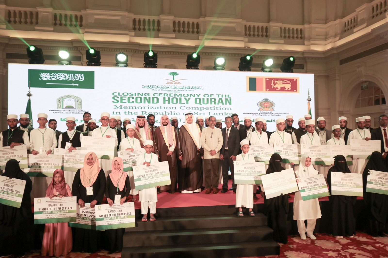 نيابة عن معالي وزير الشؤون الإسلامية والدعوة والإرشاد الشيخ الدكتور عبد اللطيف بن عبد العزيز آل الشيخ كرم وكيل وزارة الشؤون الإسلامية للدعوة والإرشاد الشيخ سعود بن عليبي الغامدي الفائزين والفائزات بمسابقة القرآن الكريم الوطنية الثانية بجمهورية سيرلانكا التي نظمتها وزارة الشؤون الإسلامية والدعوة والإرشاد بالتعاون مع الإدارة الدينية بوزارة الأديان السريلانكية وبالتنسيق مع سفارة خادم الحرمين الشريفين لدى كولمبو، بحضور معالي وزير الديانات السريلانكي السيد هينيدوما سينافي، وسفير خادم الحرمين الشريفين لدى كولمبو الاستاذ خالد بن حمود القحطاني وعدد من أعضاء البرلمان السريلانكي ورؤساء البعثات الدبلوماسية المعتمدين وسفراء الدول العربية والإسلامية في سيرلانكا.