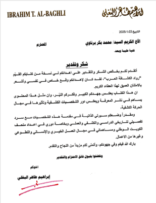 وفي خطاب شكر تلقاه (برناوي) ، قال البغلي: “لقد كان لهذا الإهداء وقع خاص في نفسي، وأشعر بامتنان عميق لهذا العطاء الكريم. فالكتاب يعكس جهدًا كبيرًا وفكرًا نيرًا، كما يُعد مرجعًا مهمًا في تسليط الضوء على دور الشخصيات الكشفية وتأثيرها في تعزيز الحركة الكشفية”.