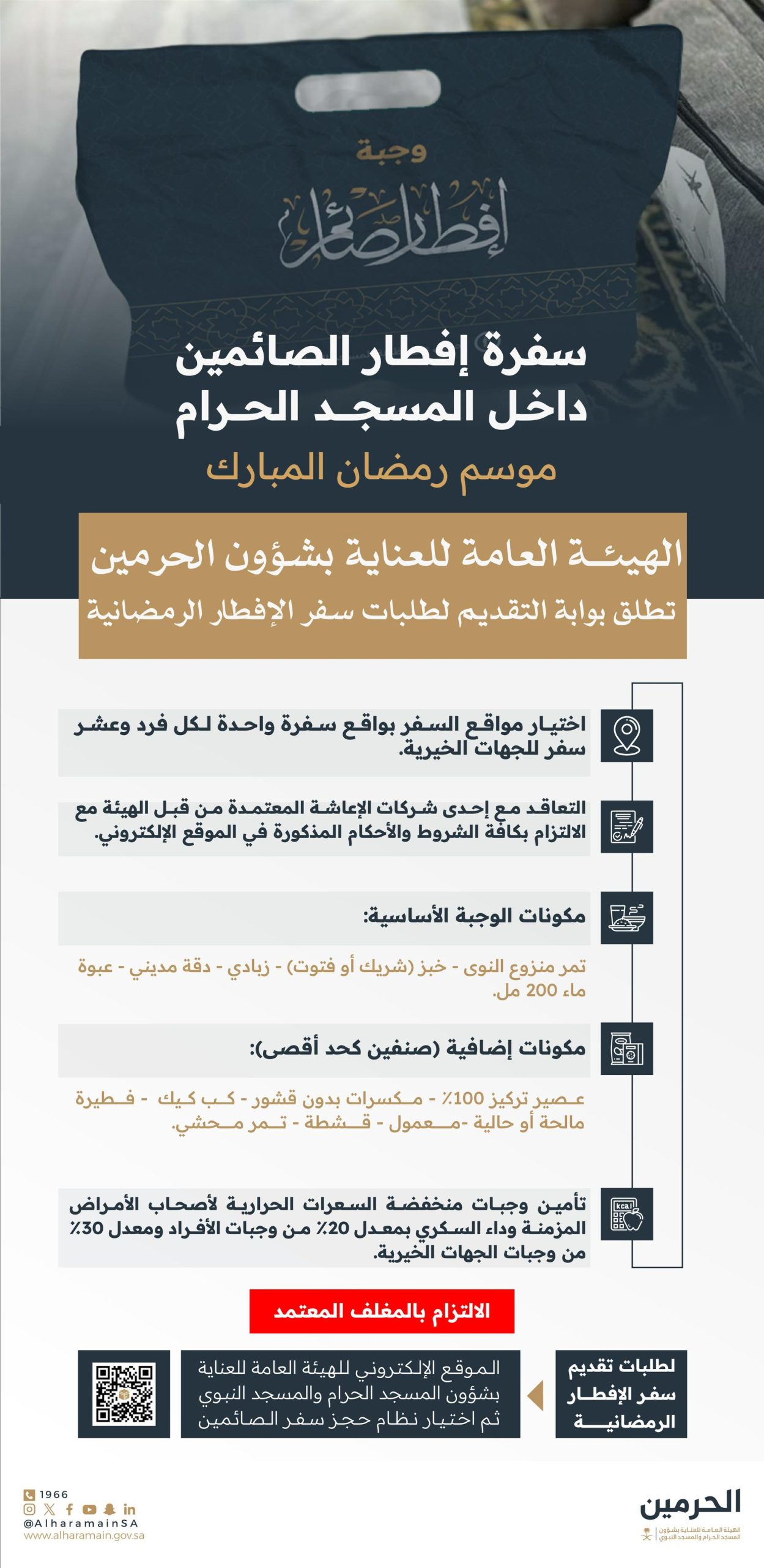 أطلقت الهيئة العامة للعناية بشؤون المسجد الحرام والمسجد النبوي بوابة مخصصة لتلقي طلبات الجهات الخيرية والأفراد لسفر إفطار الصائمين داخل المسجد الحرام خلال موسم رمضان 1446هـ.
