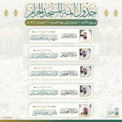 حيث يتضمن جدول أئمة المسجد الحرام لصلاة الفجر فضيلة الشيخ الدكتور بندر بليلة وصلاة الظهر والعصر والمغرب فضيلة الشيخ الدكتور الوليد الشمسان وصلاة العشاء فضيلة الشيخ الدكتور ماهر المعيقلي .