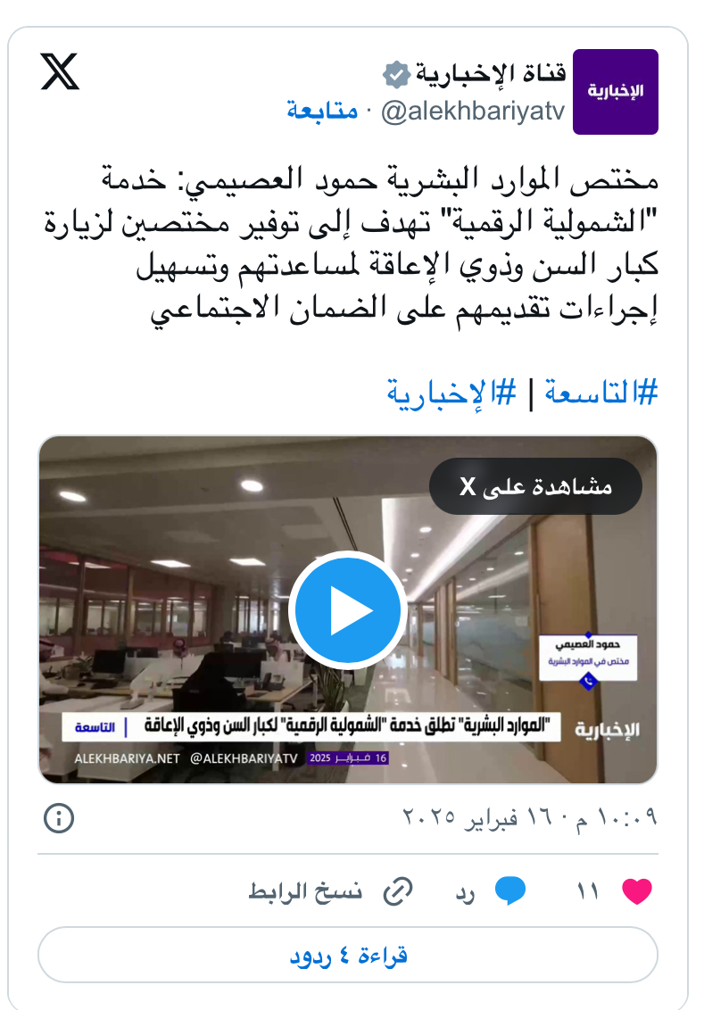 قال مختص الموارد البشرية، حمود العصيمي، إن الشمولية الرقمية” تهدف إلى توفير مختصين لزيارة كبار السن وذوي الإعاقة لمساعدتهم وتسهيل إجراءات تقديمهم على الضمان الاجتماعي.