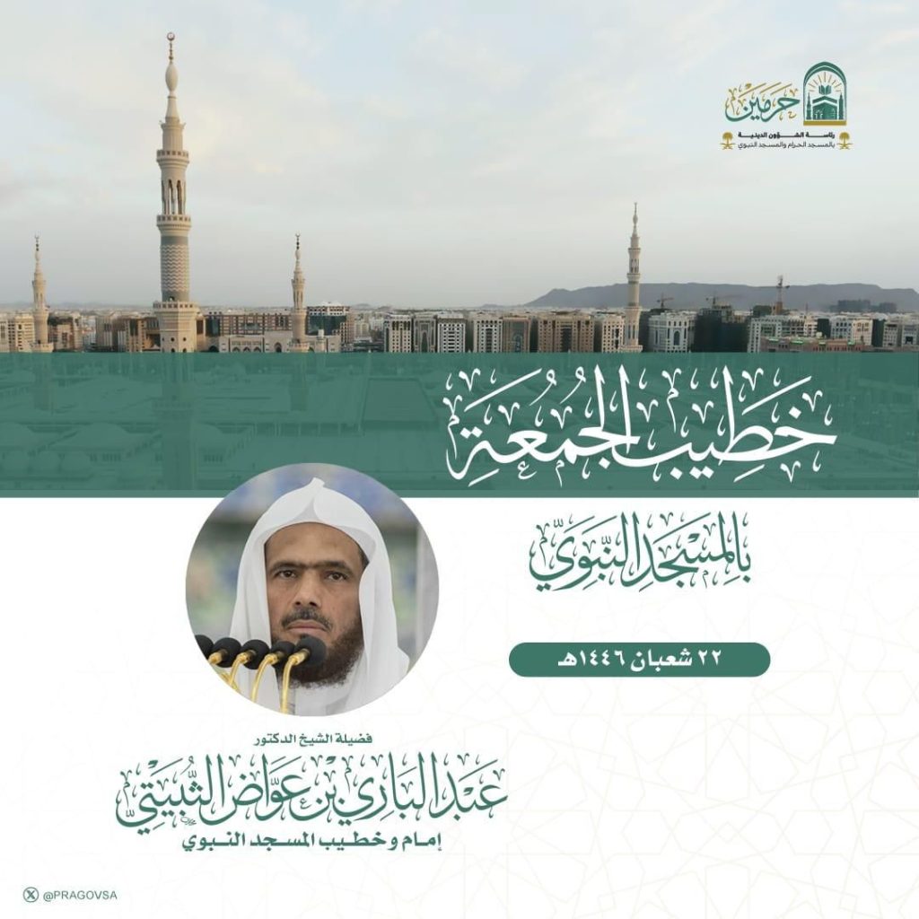 أصدرت رئاسة الشؤون الدينية بالمسجد الحرام والمسجد النبوي أمامي و خطيبي الجمعة ٢٢ شعبان ١٤٤٦هـ في الحرمين الشريفين على النحو التالي :
