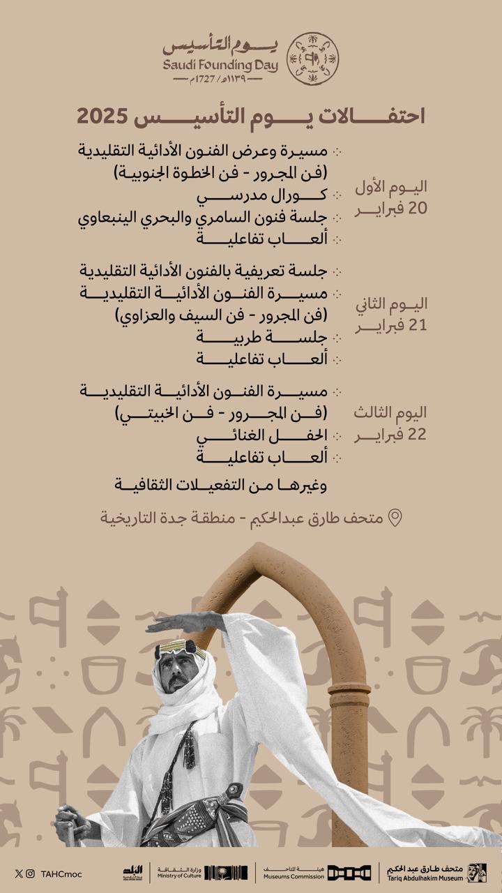 ويدعو متحف طارق عبدالحكيم الجميع إلى الحجز المسبق عبر منصة WeBook لضمان الاستمتاع بهذه الفعاليات الفريدة والاحتفاء بهذه المناسبة الوطنية في أجواء تراثية غنية بالتجارب الثقافية.