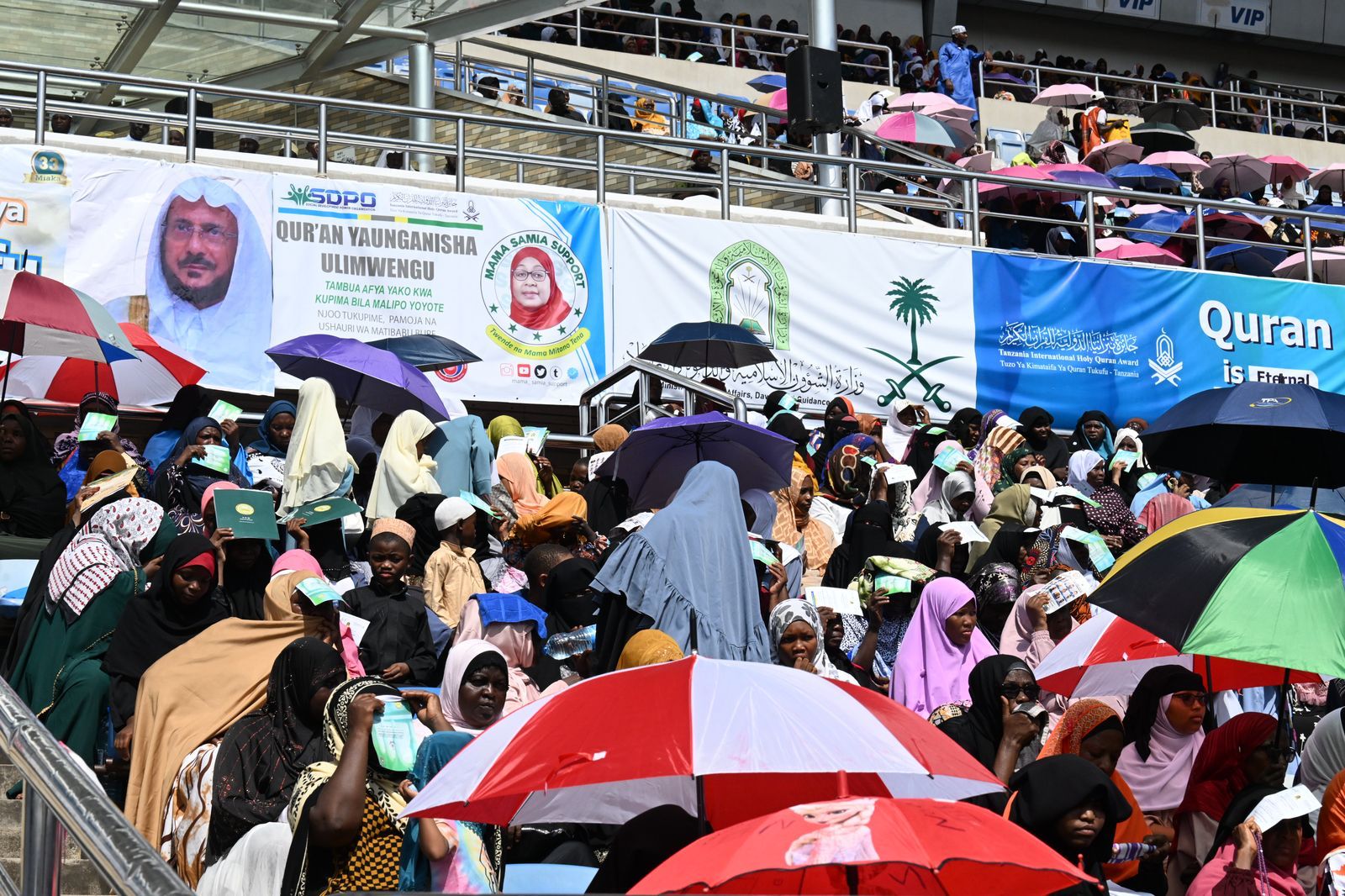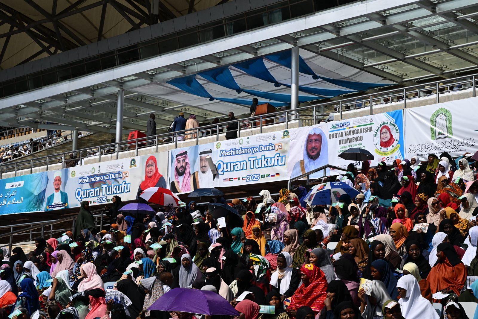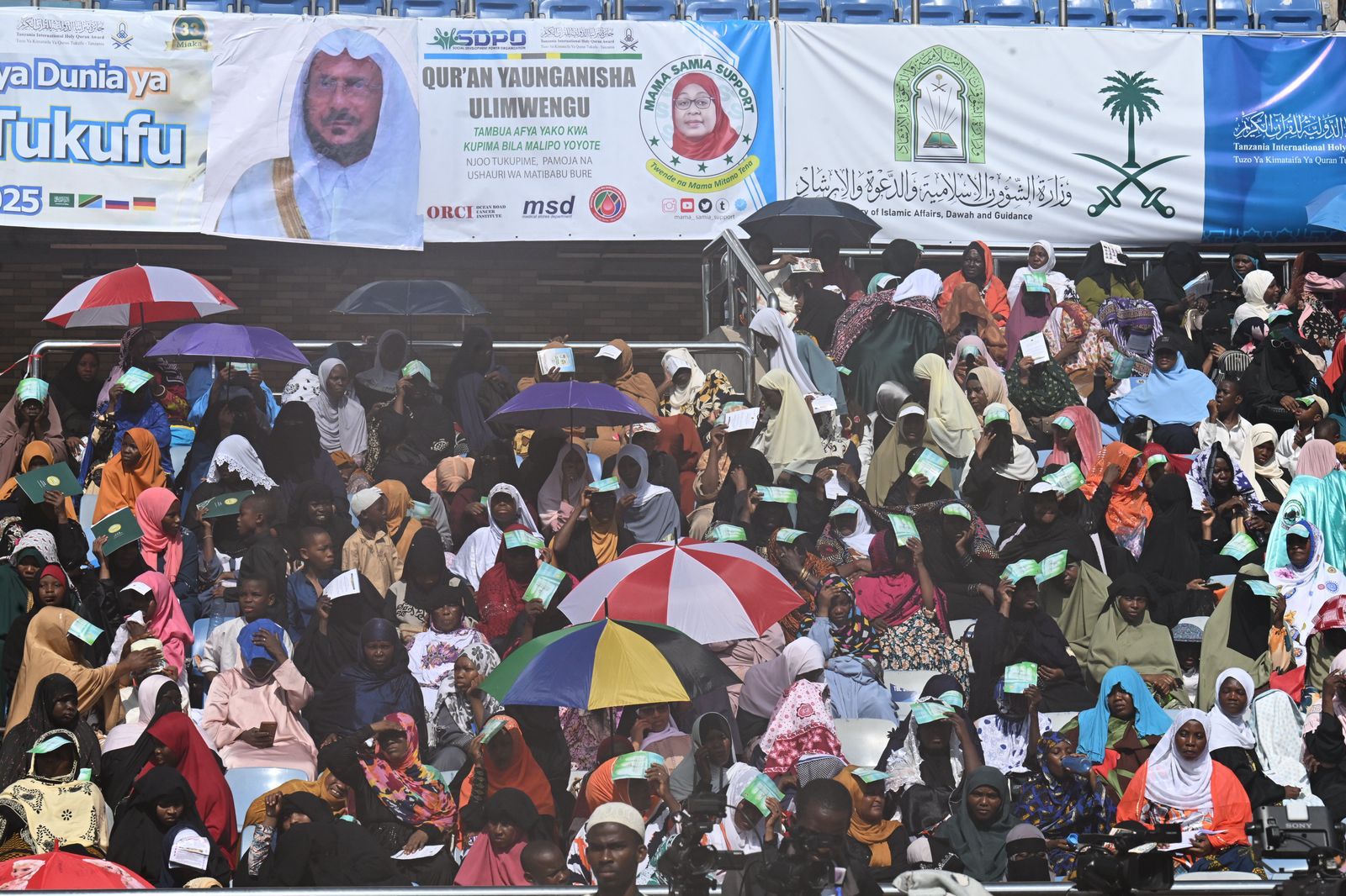 بدعم ورعاية المملكة ممثلة بوزارة الشؤون الإسلامية والدعوة والإرشاد وحضور وتشريف فخامة رئيسة جمهورية تنزانيا الاتحادية الدكتورة سامية صولوحو انطلقت اليوم التصفيات النهائية لمسابقة جائزة تنزانيا الدولية للقرآن الكريم في نسختها الـ 33؛ بمشاركة 25 متسابقاً من 25 دولة من مختلف قارات العالم؛ وذلك بالملعب الوطني بالعاصمة دار السلام، بحضور أصحاب المعالي الوزراء ونواب الوزراء وسماحة مفتي عام جمهورية تنزانيا المتحدة، ورئيس المجلس الإسلامي الأعلى الشيخ الدكتور أبو بكر بن الزبير بن علي، وفضيلة وكيل وزارة الشؤون الإسلامية والدعوة والإرشاد في المملكة الشيخ الدكتور عواد بن سبتي العنزي، وفضيلة إمام وخطيب المسجد النبوي الشريف الدكتور عبدالله بن عبدالرحمن البعيجان، وسفير خادم الحرمين الشريفين لدى جمهورية تنزانيا المتحدة يحيى عكيش، وعدد من سفراء الدول الخليجية والعربية والإسلامية.