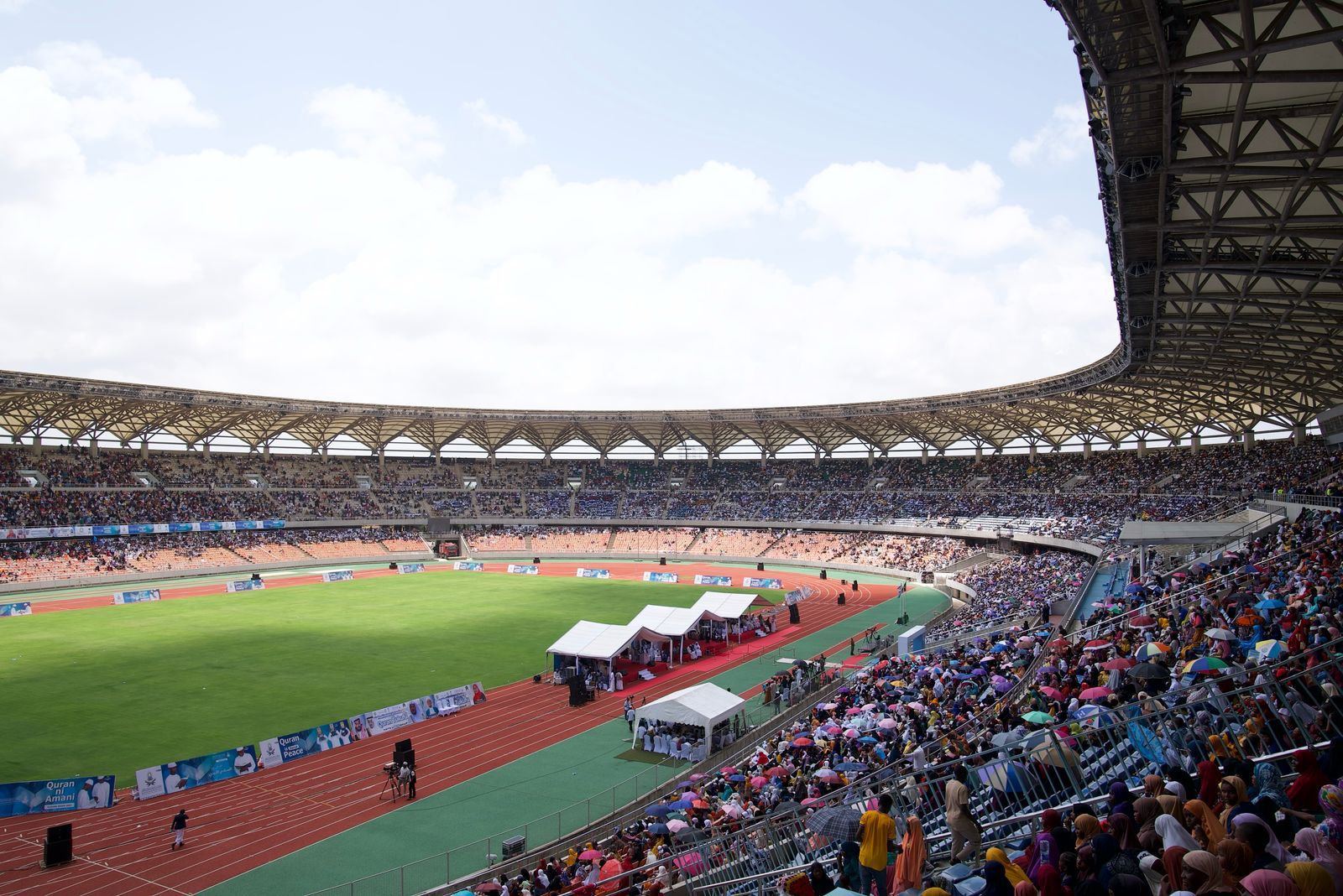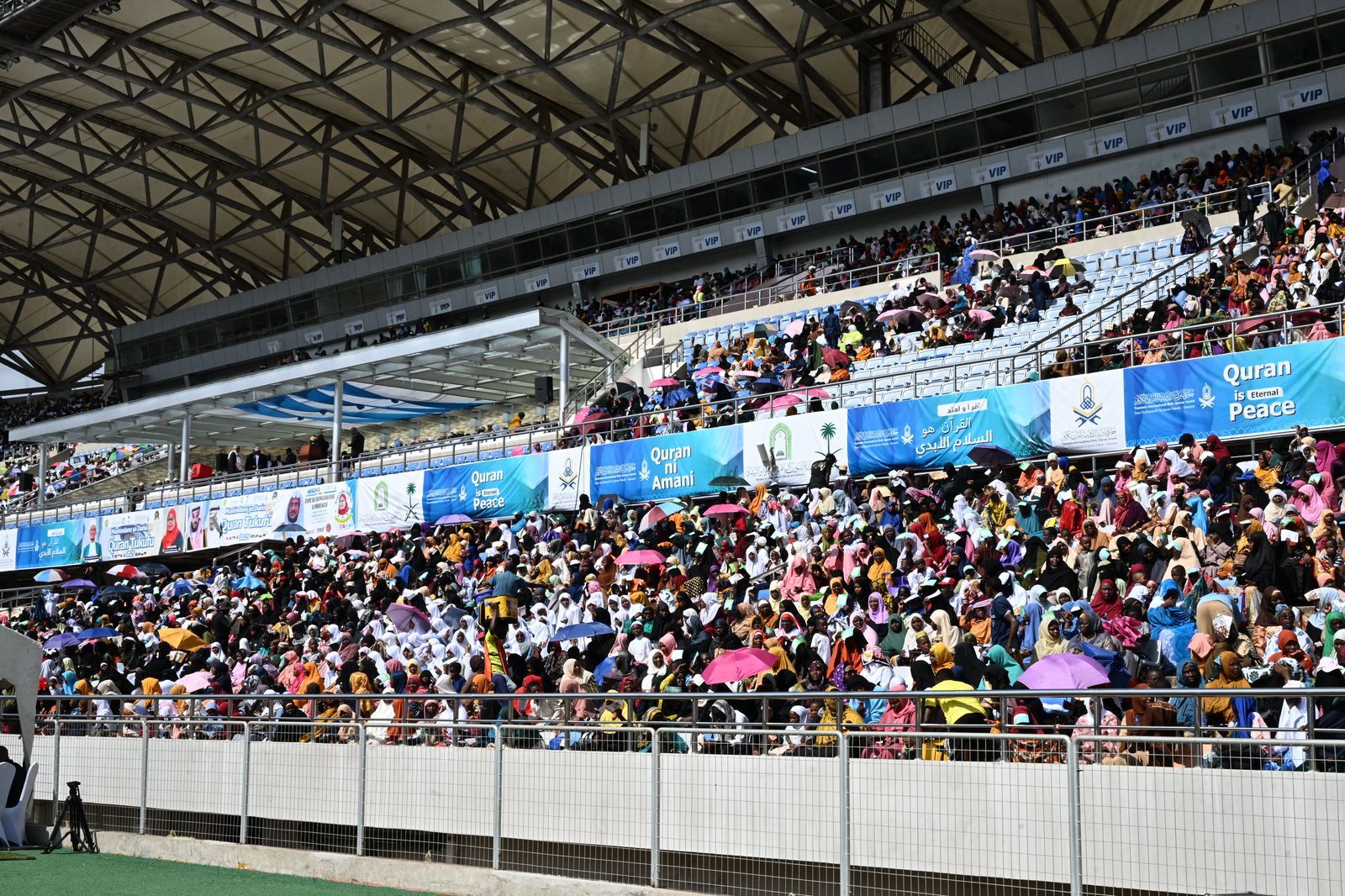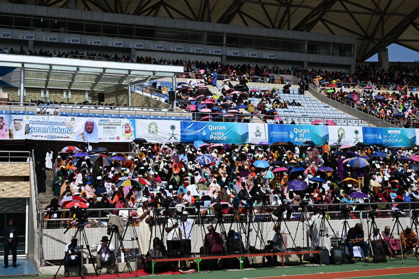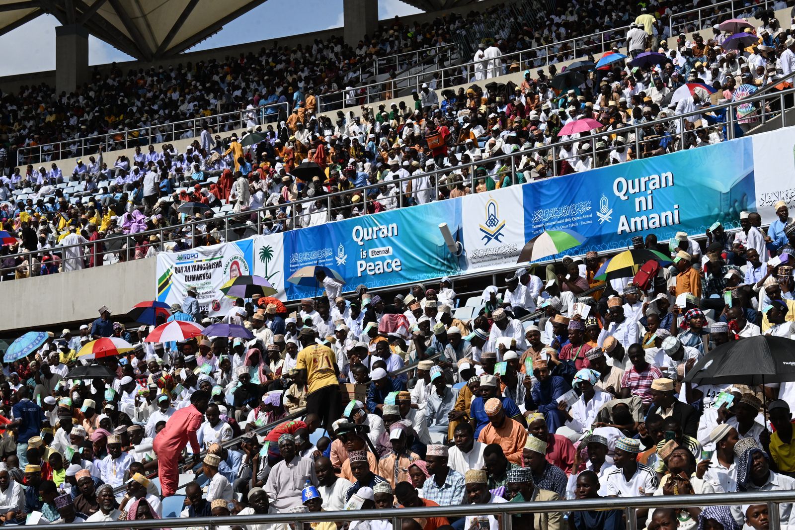 بدعم ورعاية المملكة ممثلة بوزارة الشؤون الإسلامية والدعوة والإرشاد وحضور وتشريف فخامة رئيسة جمهورية تنزانيا الاتحادية الدكتورة سامية صولوحو انطلقت اليوم التصفيات النهائية لمسابقة جائزة تنزانيا الدولية للقرآن الكريم في نسختها الـ 33؛ بمشاركة 25 متسابقاً من 25 دولة من مختلف قارات العالم؛ وذلك بالملعب الوطني بالعاصمة دار السلام، بحضور أصحاب المعالي الوزراء ونواب الوزراء وسماحة مفتي عام جمهورية تنزانيا المتحدة، ورئيس المجلس الإسلامي الأعلى الشيخ الدكتور أبو بكر بن الزبير بن علي، وفضيلة وكيل وزارة الشؤون الإسلامية والدعوة والإرشاد في المملكة الشيخ الدكتور عواد بن سبتي العنزي، وفضيلة إمام وخطيب المسجد النبوي الشريف الدكتور عبدالله بن عبدالرحمن البعيجان، وسفير خادم الحرمين الشريفين لدى جمهورية تنزانيا المتحدة يحيى عكيش، وعدد من سفراء الدول الخليجية والعربية والإسلامية.
