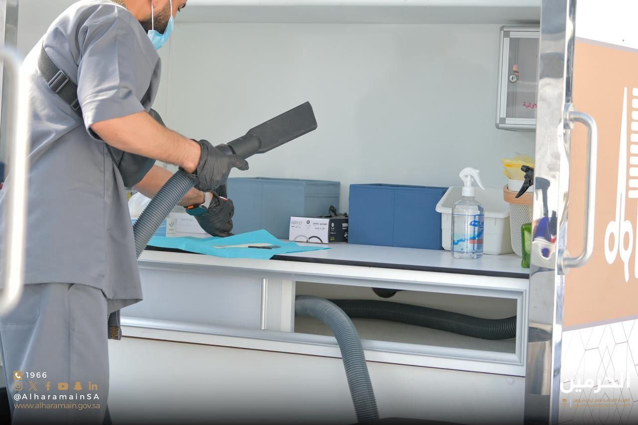 وتمكن الخدمة المعتمرين من التحلل من النسك “قص الشعر” عبر (5) مواقع مقابل منطقة المروة، ضمن عربات يمكنها التحرك في حال زيادة الحشود والتدفقات، يشرف عليها فريق متخصص وذو خبرة في تقديم الخدمة، بأدوات معقمة بالكامل، مما يضمن تقديم الخدمة بكفاءة وسرعة مع الالتزام بأعلى معايير الجودة والسلامة.