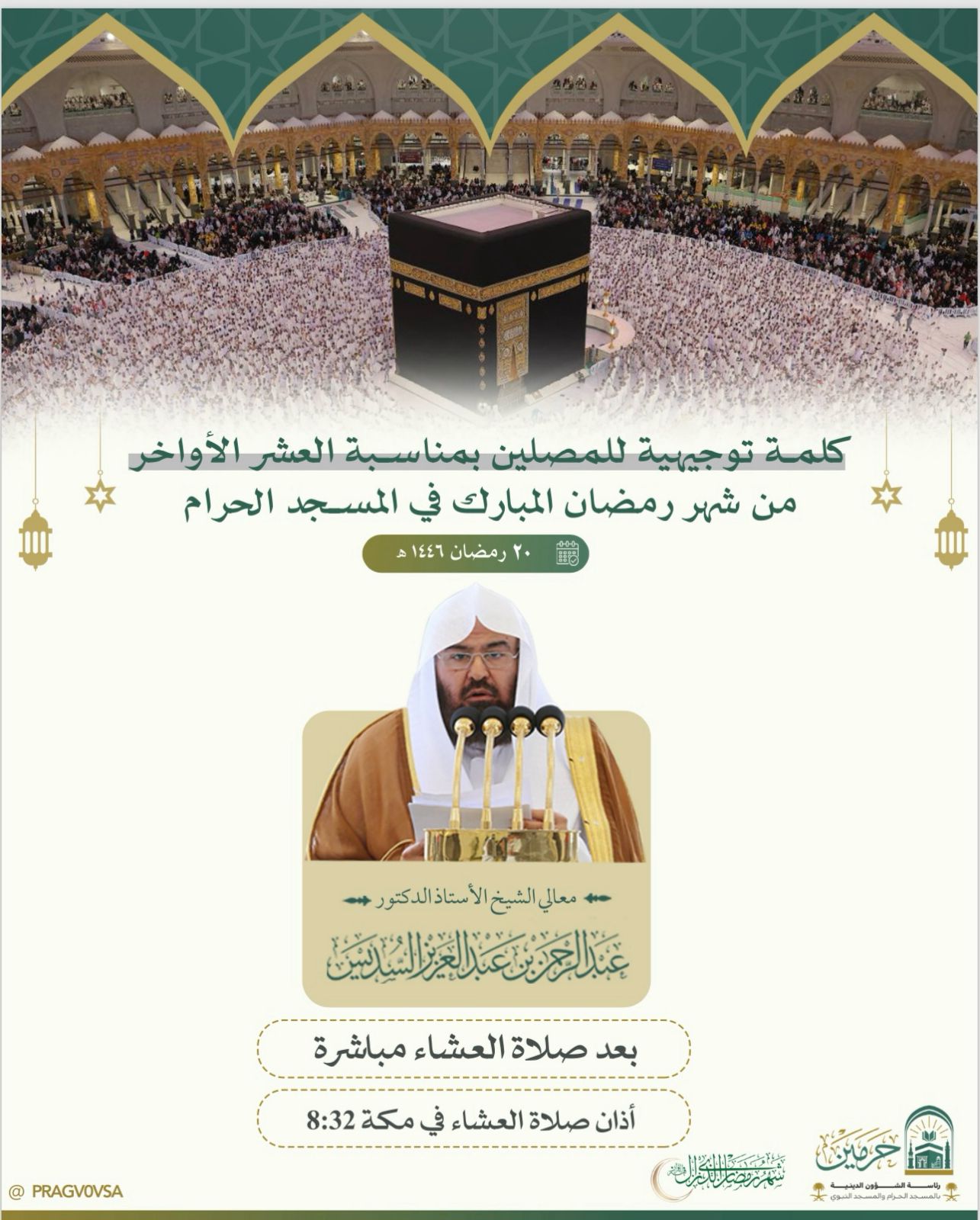 جاء ذلك في الكلمة التوجيهية التي ألقاها معاليه بعد صلاة العشاء اليوم في الحرم المكي ،  بمناسبة دخول العشر الأواخر من الشهر الفضيل .