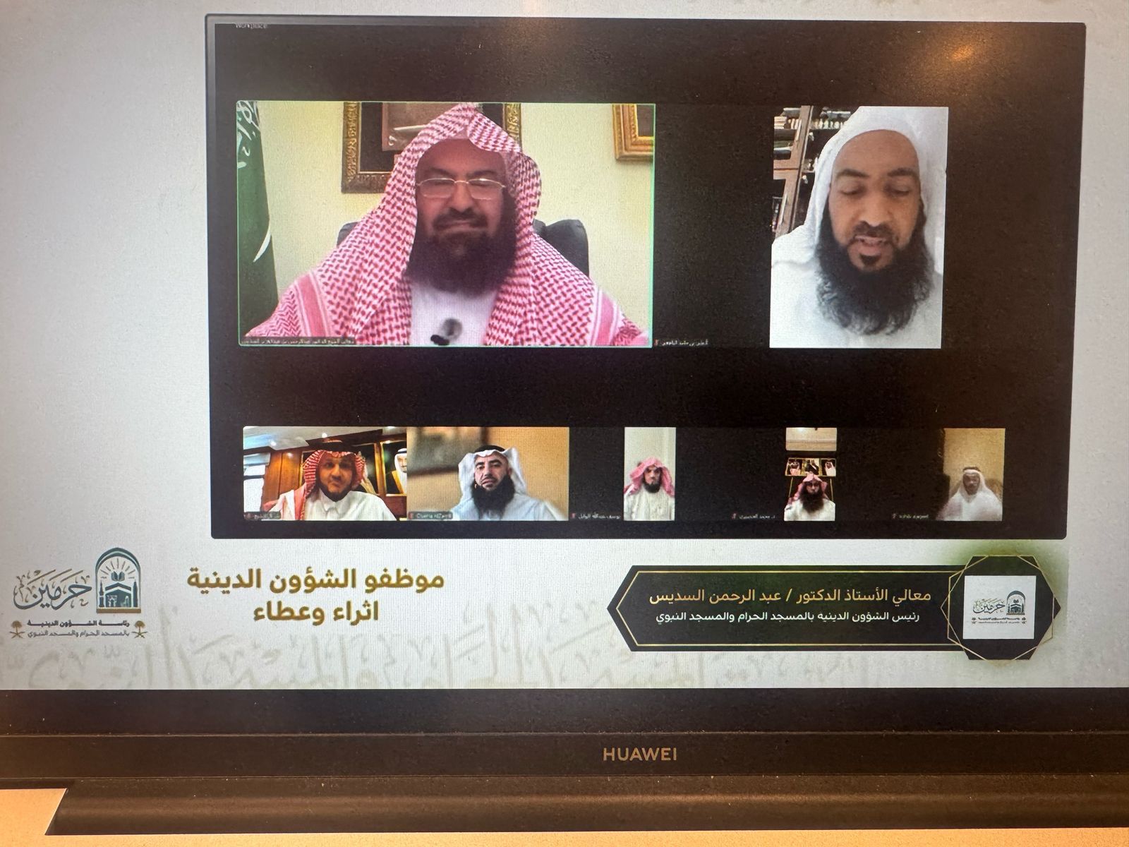 وختاماً هنأ معاليه في كلمته التي ألقاها في حلقة النقاش عن بُعد بعنوان “موظفو الشؤون الدينية إثراء وعطاء”؛ المنسوبين والمنسوبات المفرَّغين لملاك الرئاسة. مؤكدًا على ضرورة استمرارهم في المثابرة والاجتهاد والإخلاص؛ لإثراء تجربة القاصدين والزائرين، وإيصال رسالة الحرمين للعالم باللغات المختلفة.