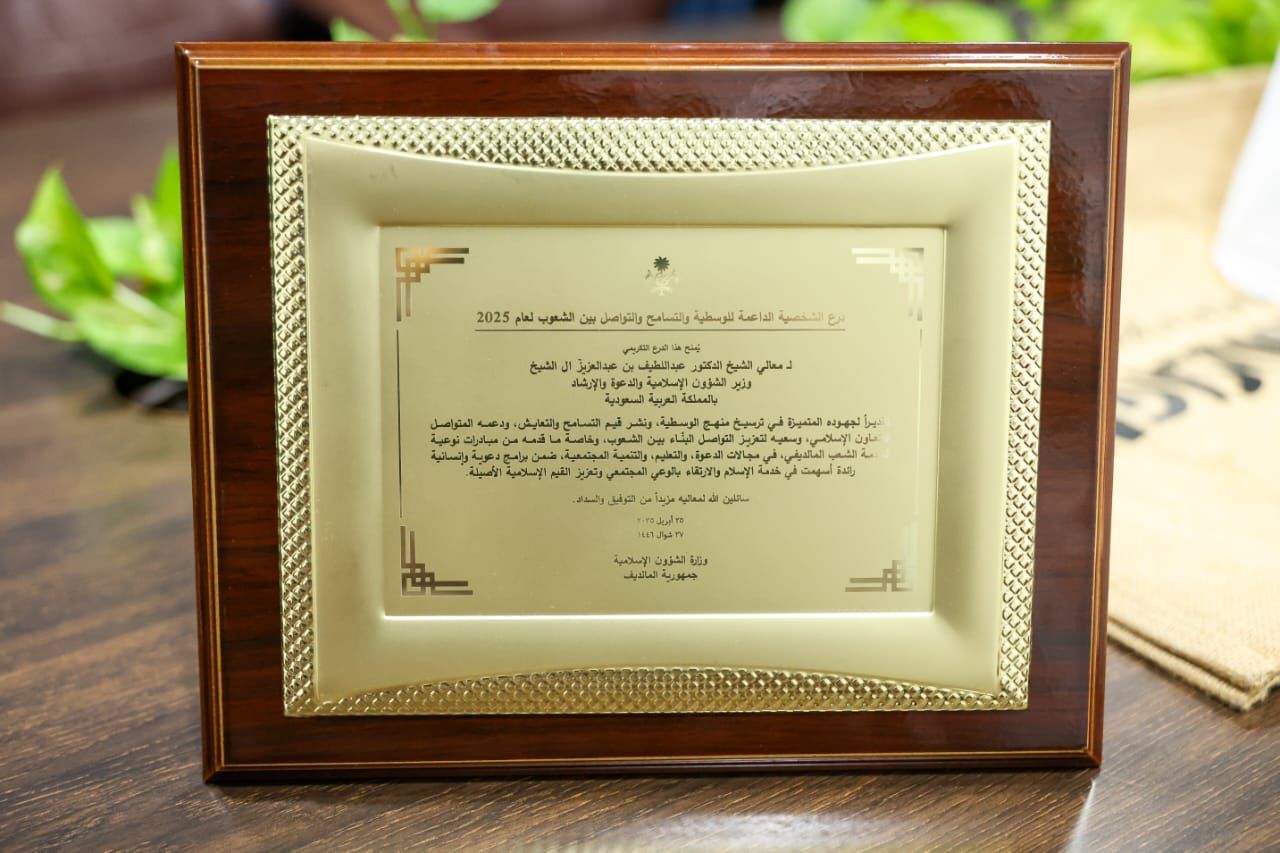 ويُعد هذا التكريم تقديراً لما يبذله معالي الوزير من جهود بارزة في ترسيخ منهج الوسطية والاعتدال، ونشر قيم التسامح والتعايش، وتعزيز التواصل البنّاء بين الشعوب، إلى جانب دعمه المتواصل للتعاون الإسلامي، وما قدّمه من مبادرات نوعية لخدمة الشعب المالديفي في مجالات الدعوة، والتعليم، والتنمية المجتمعية، ضمن برامج دعوية وإنسانية أسهمت في تعزيز الوعي المجتمعي وترسيخ القيم الإسلامية الأصيلة.