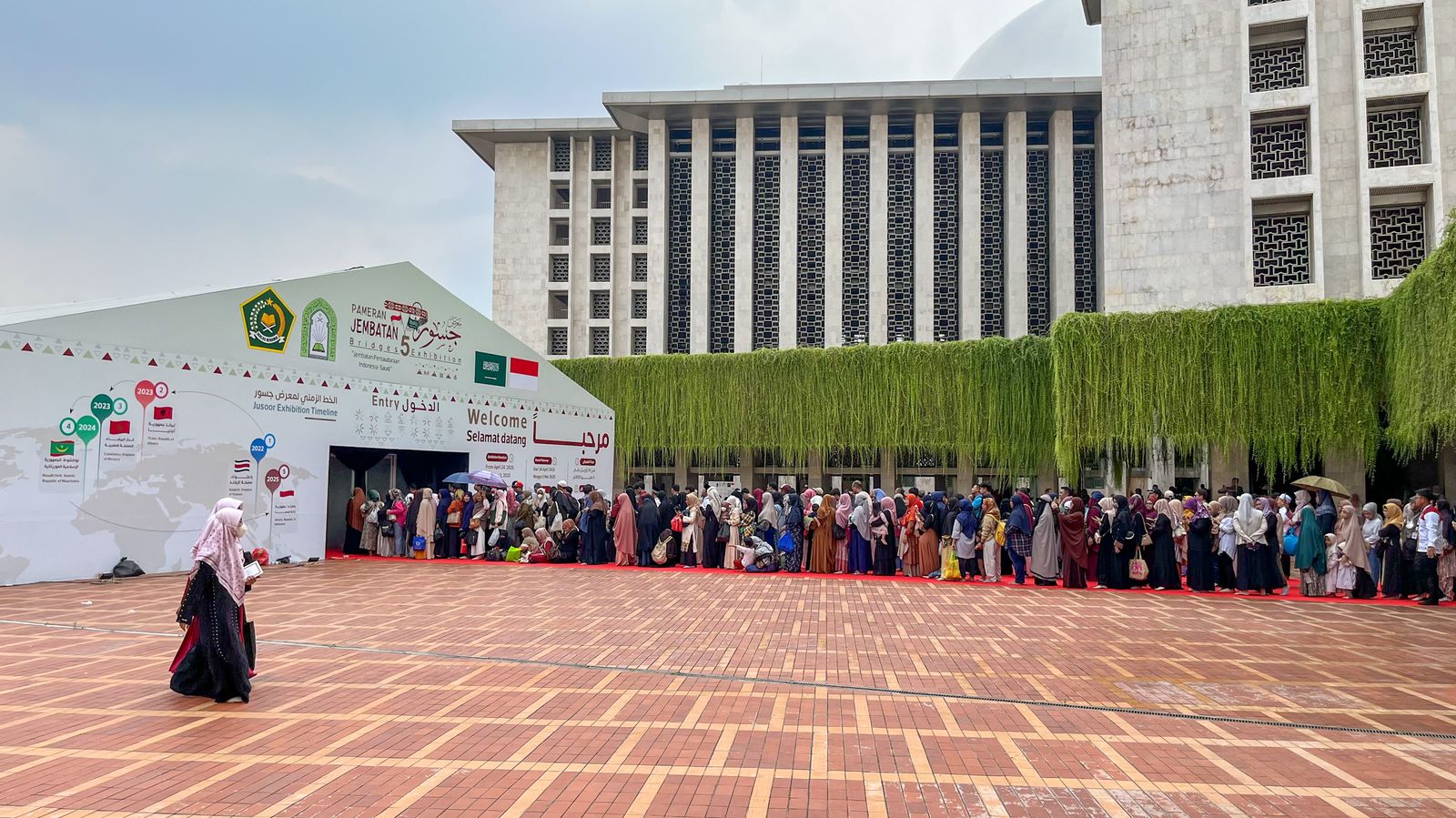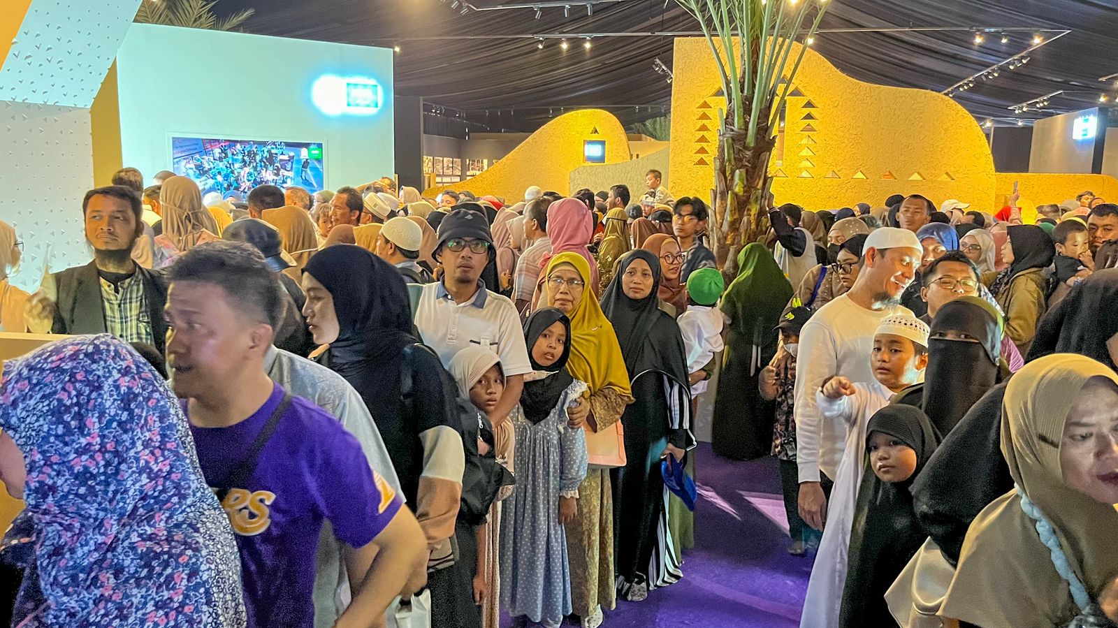 وقد بدأ توافد الزوار منذ ساعات الصباح الأولى، حيث اصطف المئات أمام أبواب المعرض منذ الساعة الثامنة صباحاً، في مشهد يعكس مكانة المملكة العربية السعودية ومكانة الحرمين الشريفين في قلوب المسلمين الإندونيسيين.