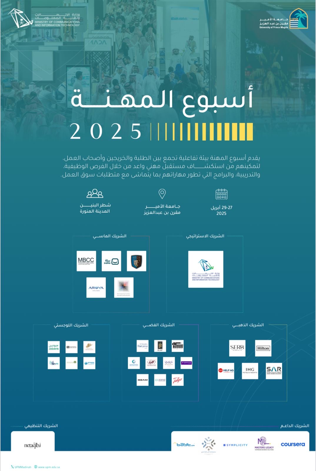 تحت رعاية معالي رئيس جامعة الأمير مقرن بن عبد العزيز، الدكتور بندر بن محمد حجار، دشنت الجامعة يوم الأحد ٢٧ إبريل فعاليات “أسبوع المهنة 2025” بنسخته الأولى، والذي يستمر حتى يوم الثلاثاء 29 أبريل، بالشراكة الاستراتيجية مع وزارة الاتصالات وتقنية المعلومات.