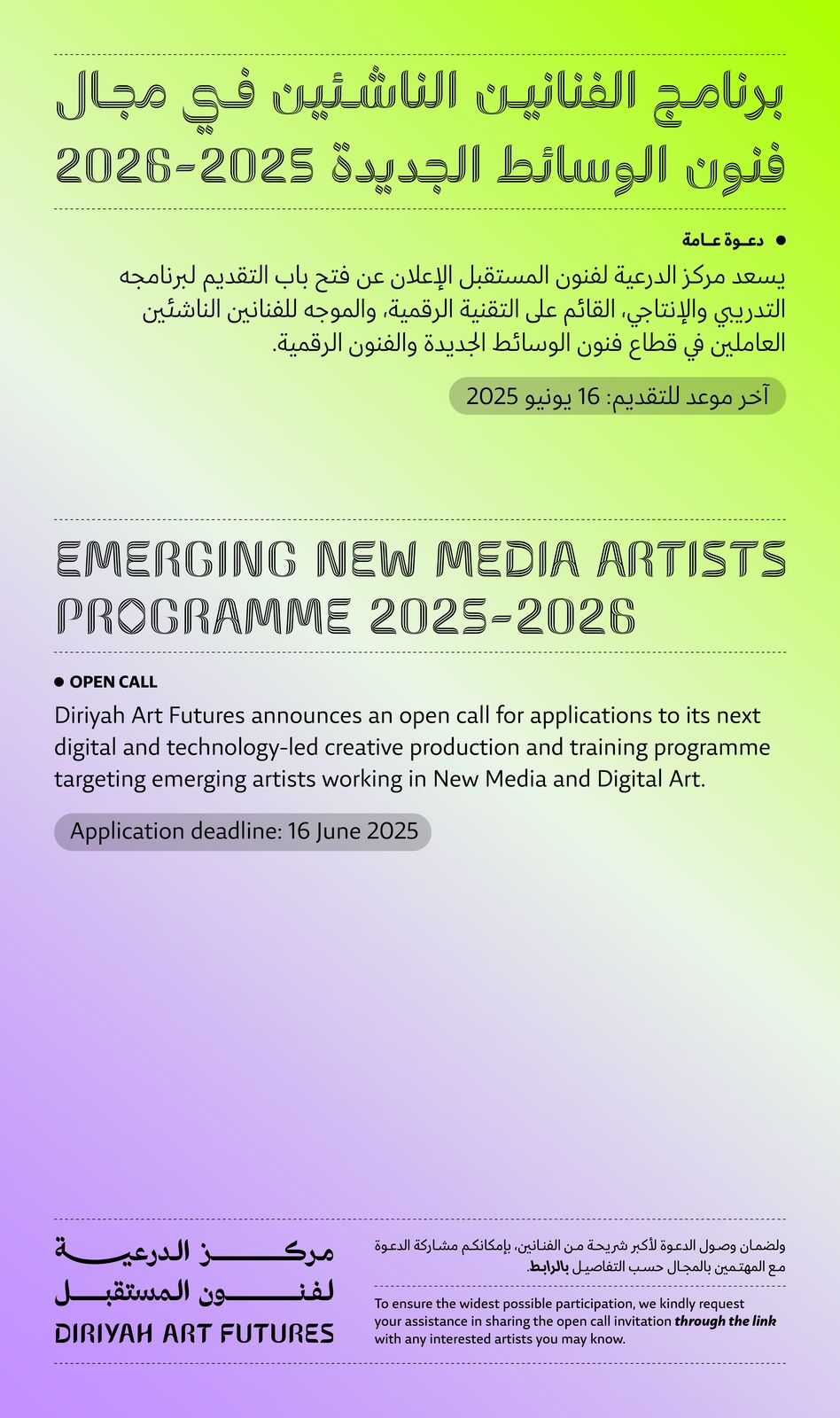 أعلن مركز الدرعية لفنون المستقبل، أول مركز متخصص في فنون الوسائط الجديدة في منطقة الشرق الأوسط وشمال إفريقيا، عن فتح باب التقديم للدورة السنوية الثانية من برنامج الفنانين الناشئين في مجال فنون الوسائط الجديدة ، بالتعاون مع الاستوديو الوطني للفنون المعاصرة “لوفرينوا” بفرنسا، ومن المقرر إطلاقه في أكتوبر 2025.