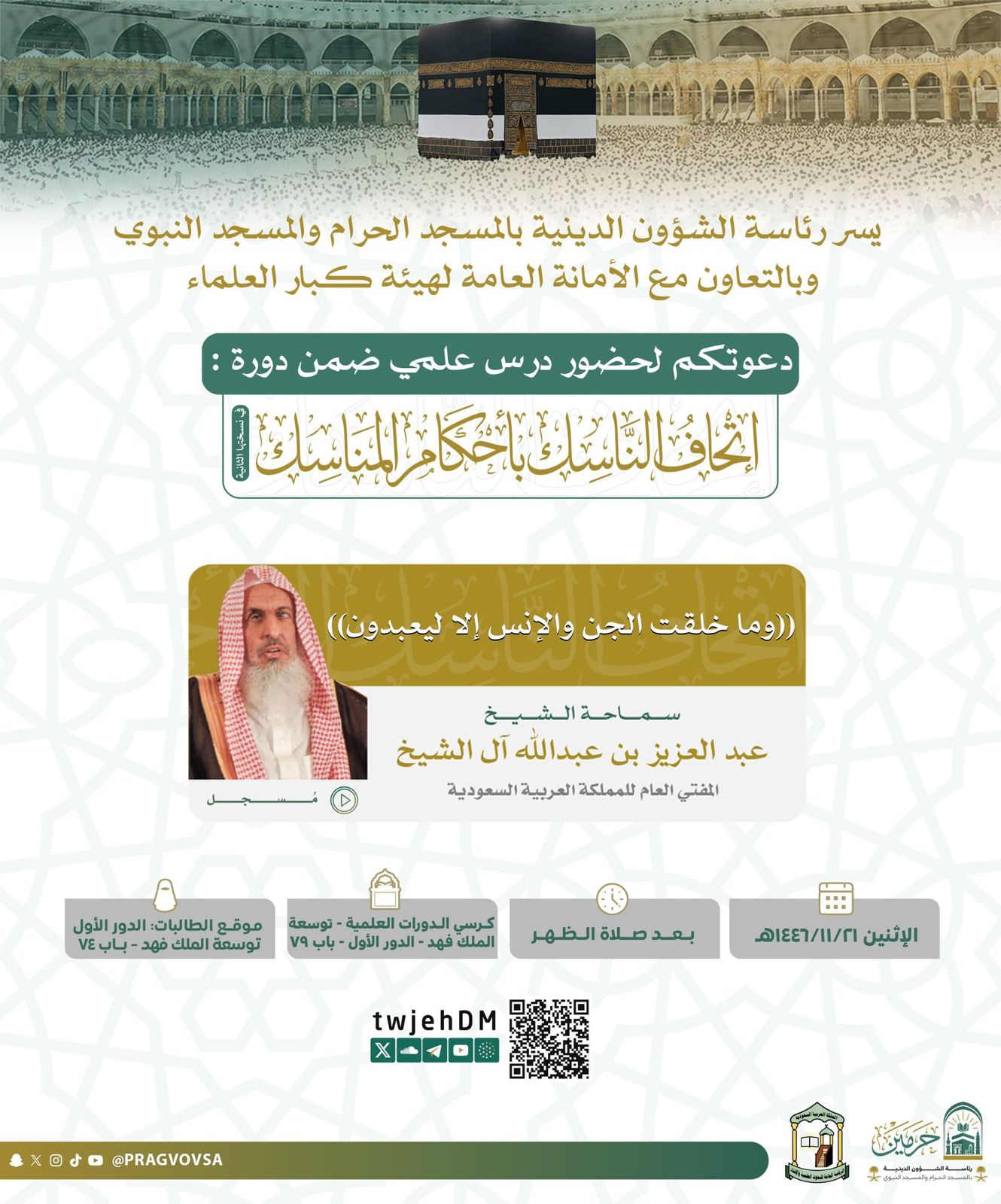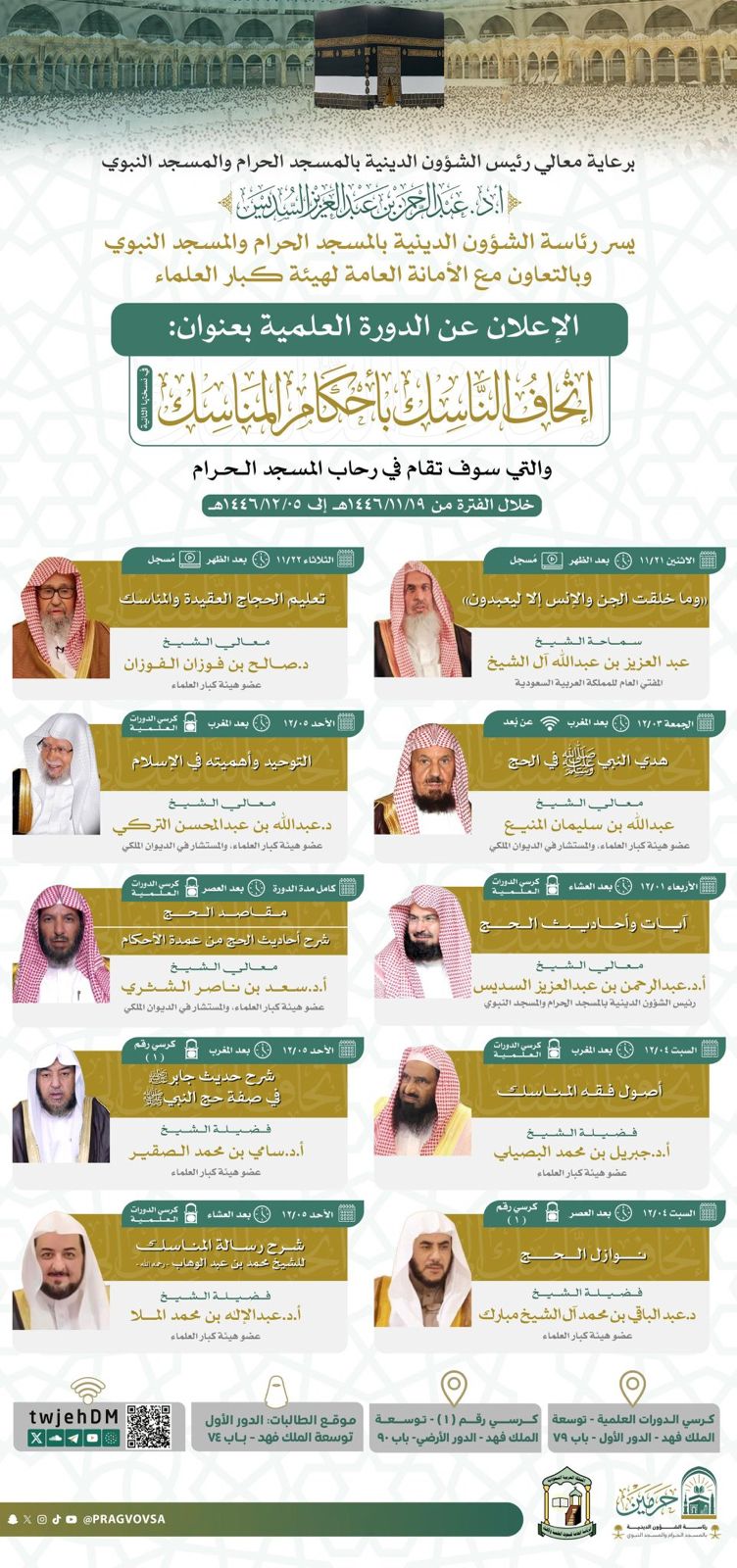ويأتي عنوان الدورة متوافقاً مع موسم الحج “إتحاف الناسك بأحكام المناسك”.. وتعد الدورة العلمية الأكبر من نوعها في المسجد الحرام تُقام هذه الدورة العلمية بإشراف رئاسة الشؤون الدينية بالمسجد الحرام والمسجد النبوي، بالتعاون مع الأمانة العامة لهيئة كبار العلماء، وذلك خلال الفترة من 19 ذي القعدة 1446هـ إلى 5 ذي الحجة 1446هـ.