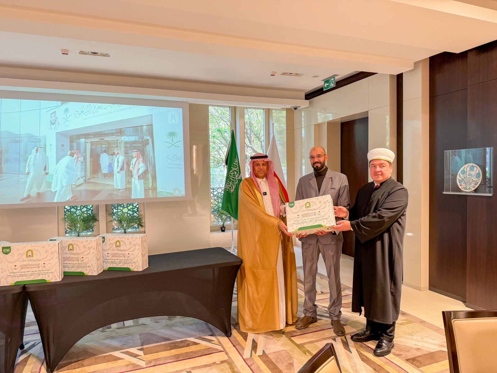 أقامت وزارة الشؤون الإسلامية والدعوة والإرشاد حفل توزيع ضيوف برنامج خادم الحرمين الشريفين الملك سلمان بن عبدالعزيز آل سعود- حفظه الله – للحج والعمرة والزيارة للعام 1446هـ، بمقر سفارة خادم الحرمين الشريفين لدى جمهورية بولندا بحضور سفير المملكة الأستاذ سعد بن صالح الصالح و مفتي جمهورية بولندا رئيس الاتحاد الإسلامي الشيخ توماش ميشكيفيتش، والمتحدث الرسمي لوزارة الشؤون الإسلامية عبدالله بن يتيم العنزي وعدد من المسؤولين بالسفارة وضيوف البرنامج لهذا العام .