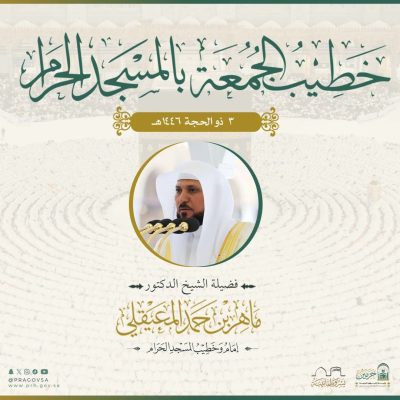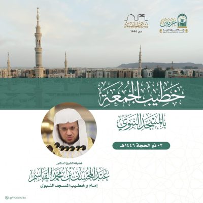 أعلنت رئاسة الشؤون الدينية بالمسجد الحرام والمسجد النبوي إمامي وخطيبي الجمعة ليوم الجمعة الموافق 3 ذو الحجة 1446هـ في الحرمين الشريفين على النحو التالي :