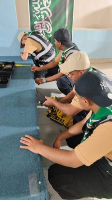 وكان في استقبال الفرقة قائد المعسكر المهندس وليد الزويمل، حيث باشرت الفرقة فور وصولها تنفيذ عدد من أعمال الصيانة، شملت التمديدات الصحية، وتنظيم المسرح الخاص بالمعسكر، في إطار مساهمتها في تهيئة الأجواء المناسبة للمشاركين.
