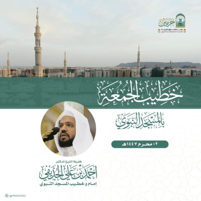 أما في المسجد النبوي فيتولى الخطابة والإمامة فضيلة الشيخ الدكتور أحمد بن علي الحذيفي،