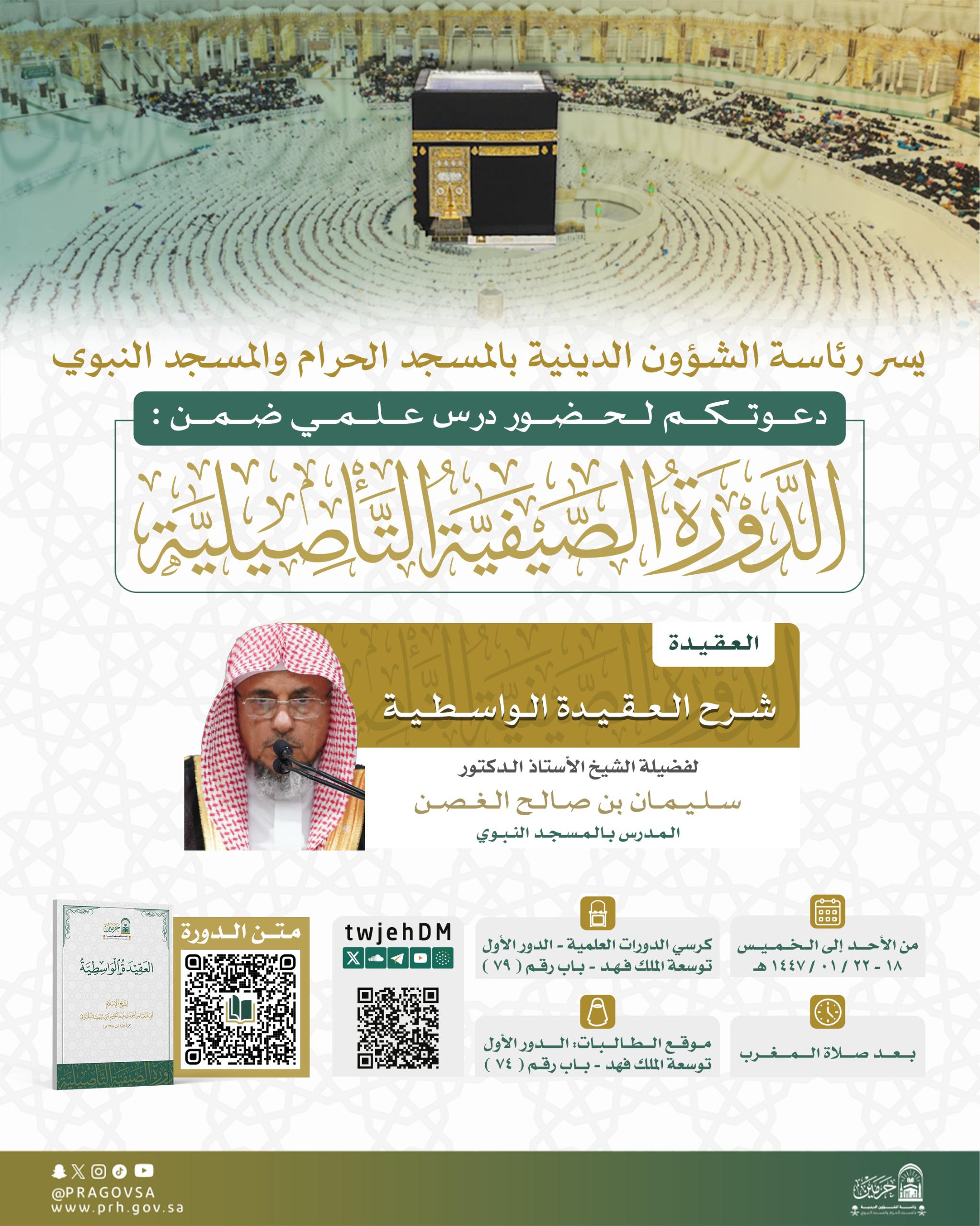 يسرُّ رئاسة الشؤون الدينية بالمسجد الحرام والمسجد النبوي دعوتكم لحضور درس علمي بعنوان: “شرح العقيدة الواسطية” ضمن الدورة الصيفية التأصيلية في المسجد الحرام والذي يُقدّمه فضيلة الشيخ الأستاذ الدكتور سليمان الغصن ، المدرس في المسجد النبوي.
