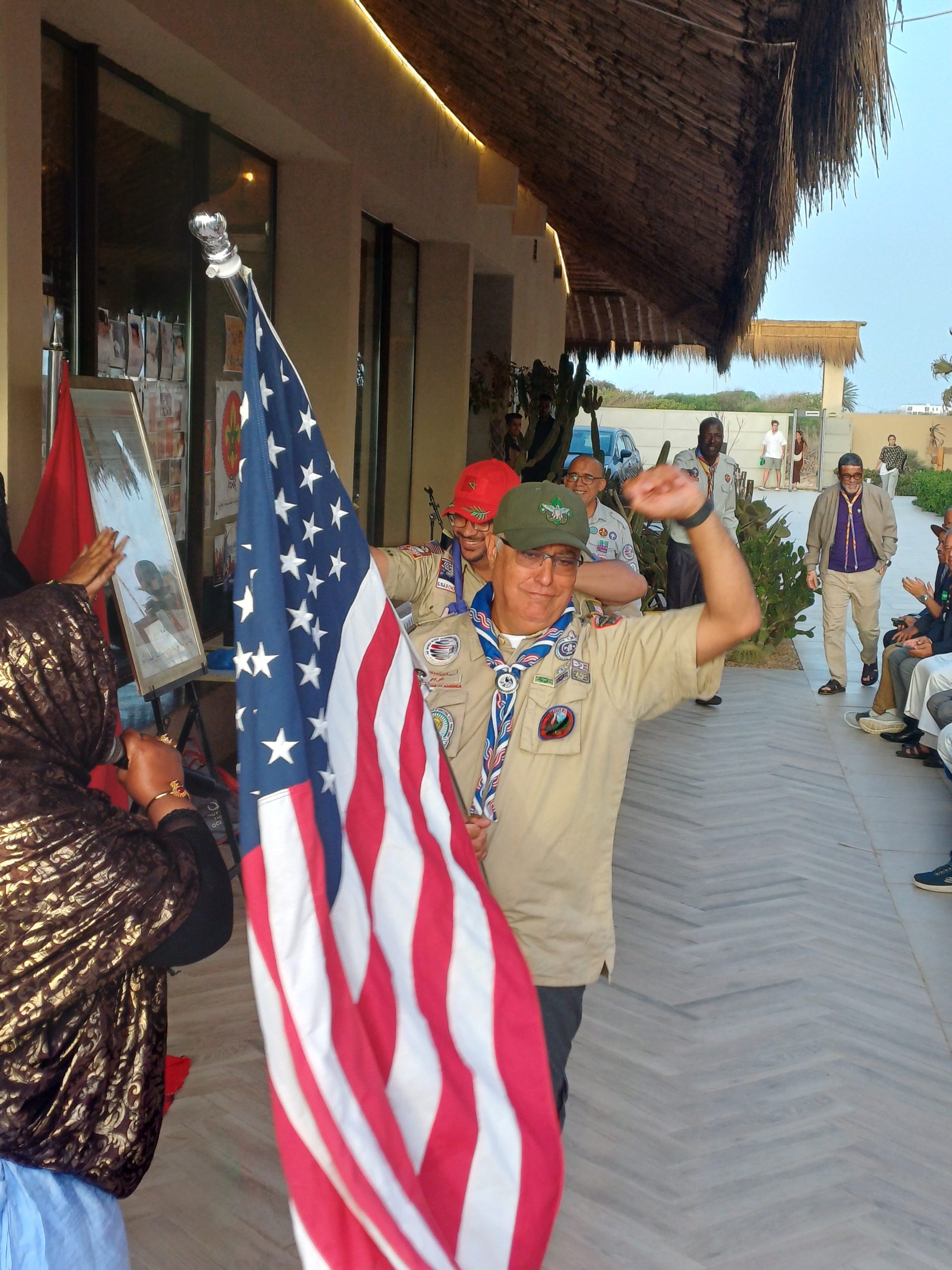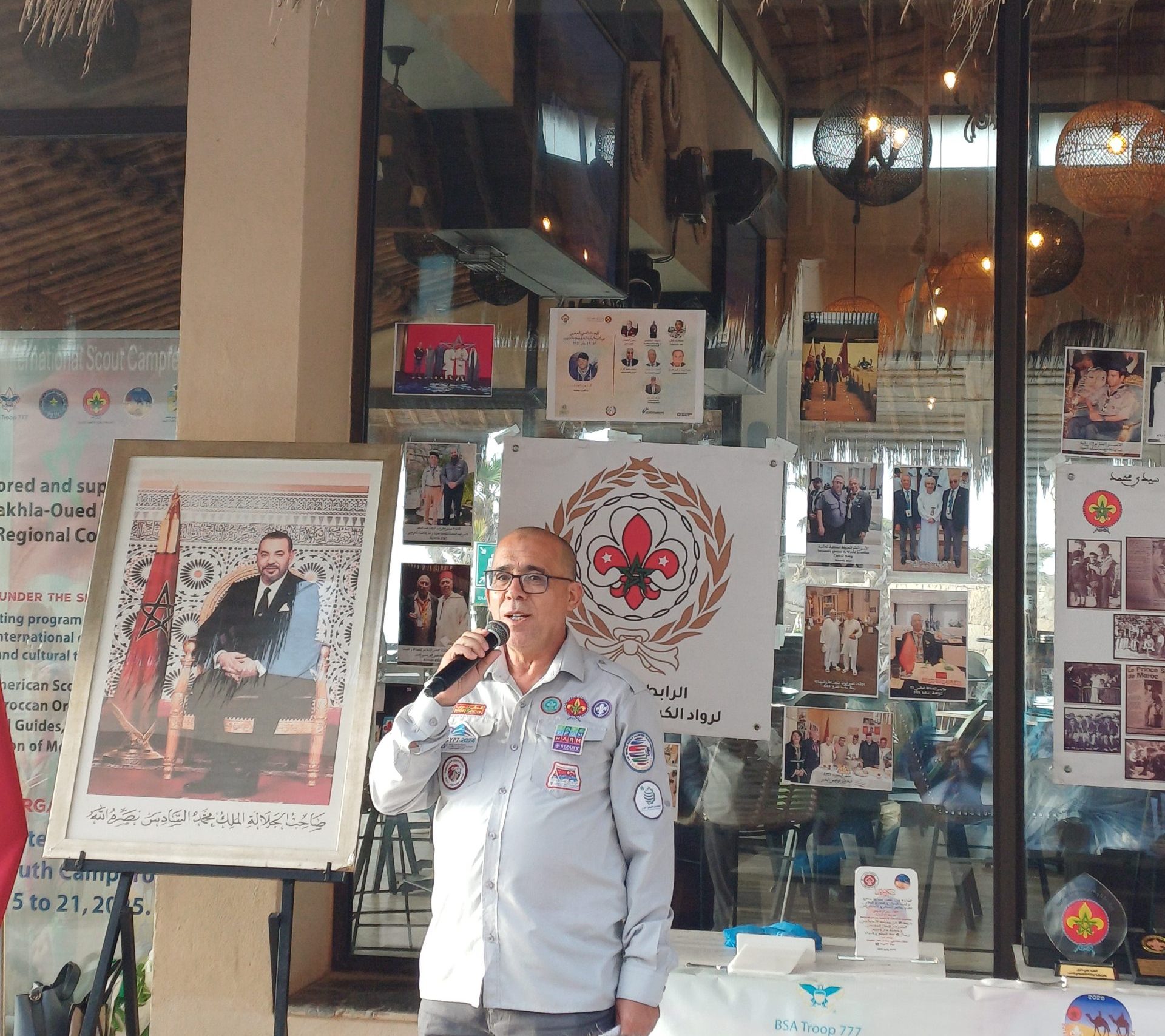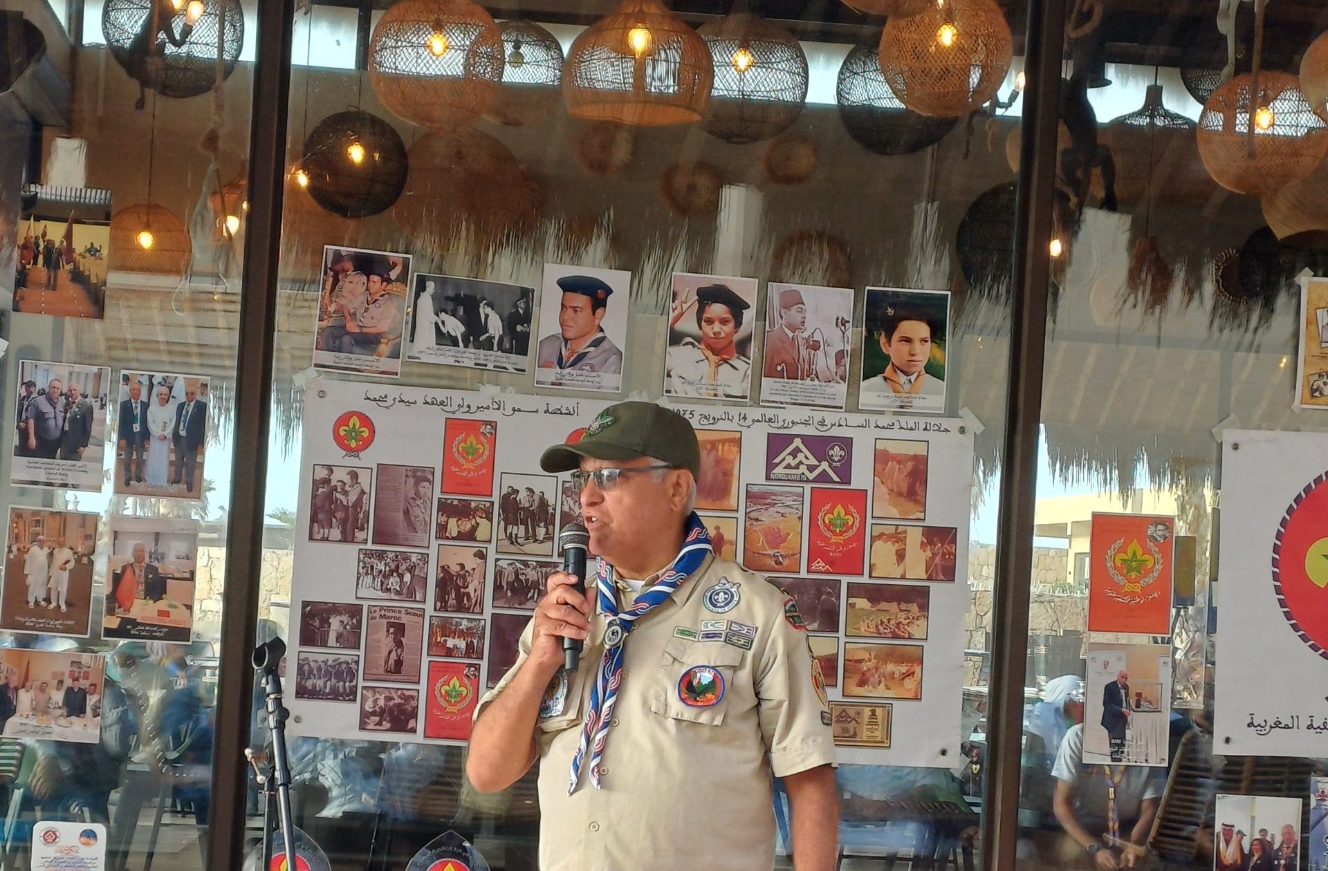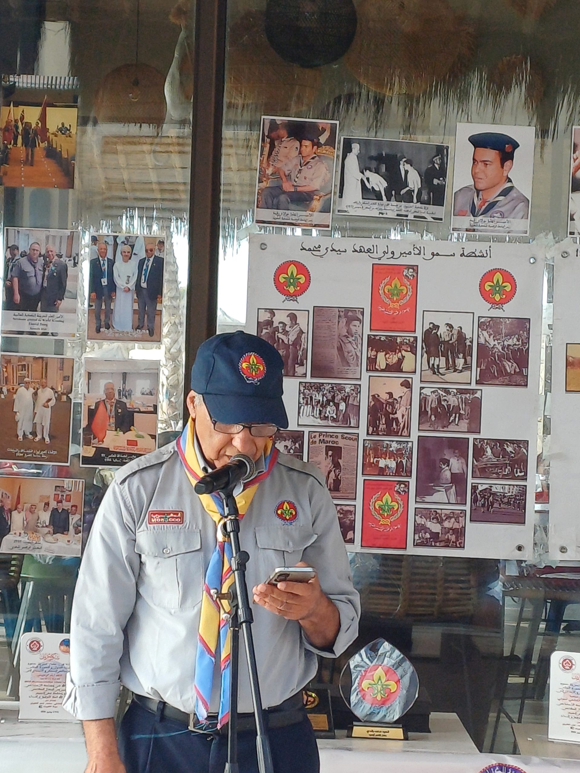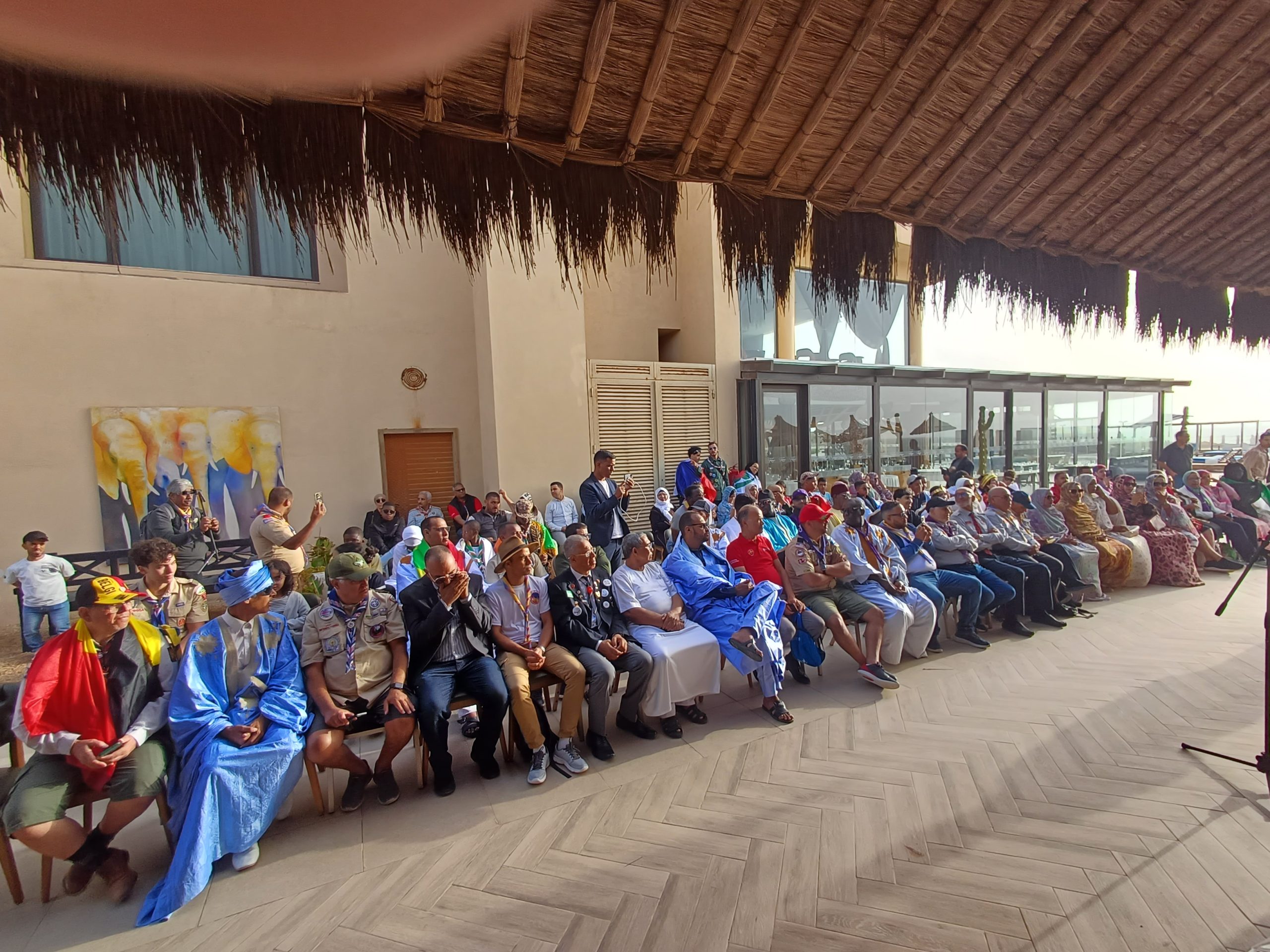 ألقى بعدها السيد عزيز حافظي رئيس الجامعة الكشفية المغربية كلمة عبر فيها عن سعادته بإقامة المخيم موجها شكره للمشاركين ودولهم على هذا الحضور ومثمنا دور الجامعة الكشفية المغربية ورواد الكشافة في الداخلة وادي الذهب على نجاح التنظيم