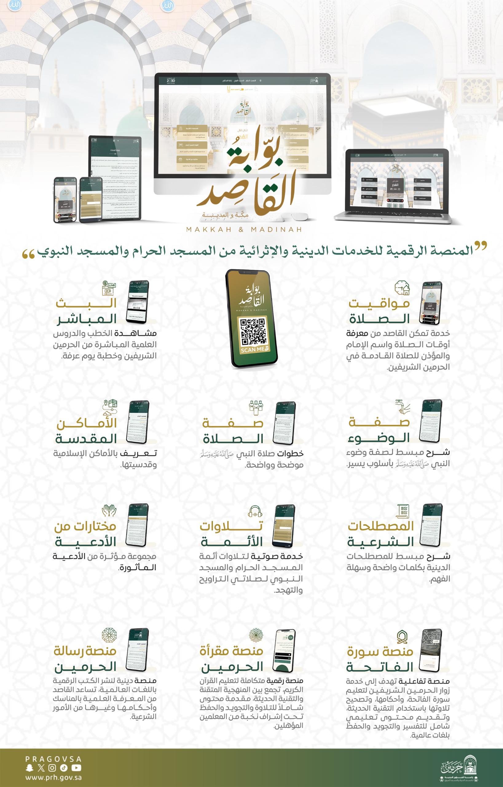 ‏فعلت رئاسة الشؤون الدينية بالمسجد الحرام والمسجد النبوي١١ برنامجا إثرائيا ، عبر المنصة الرقمية الأضخم (بوابة قاصد).