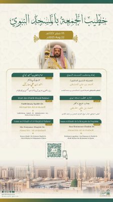 أعلنت رئاسة الشؤون الدينية بالمسجد الحرام والمسجد النبوي، عن أسماء خطيبي وأئمة صلاة الجمعة في الحرمين الشريفين ليوم الجمعة الموافق 28 صفر 1447هـ وذلك ضمن جدولها الدوري لتنظيم الإمامة والخطابة.