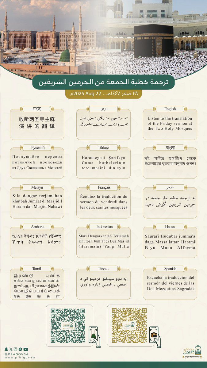 تدعوكم رئاسة الشؤون الدينيه الى الاستماع الى ترجمة خطبة الجمعة من المسجد الحرام والمسجد النبوي بعدة لغات: