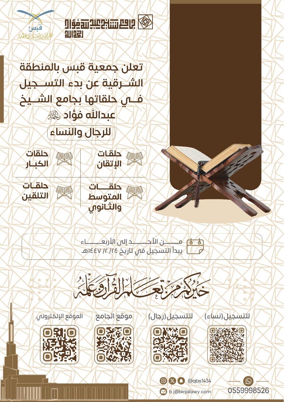 وفي سياق متصل، أعلنت الجمعية، عبر فرعها في المنطقة الشرقية، عن أولى حلقاتها القرآنية للرجال والنساء في جامع الشيخ عبدالله فؤاد بالخبر، حيث تهدف هذه الخطوة إلى توسيع نطاق خدمات الجمعية لتشمل المدن الرئيسة في المنطقة الشرقية وتوفير الفرصة للمستفيدين للانضمام إلى برامجها التعليمية، وقد سهلّت الجمعية عملية التسجيل للراغبين من خلال توفير روابط مخصصة للرجال والنساء للتسجيل عبر حسابها على منصة (x) :