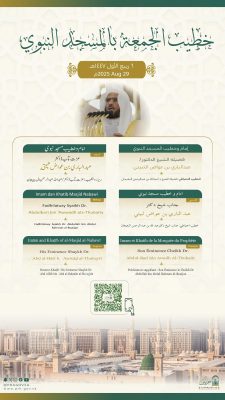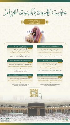 أعلنت رئاسة الشؤون الدينية بالمسجد الحرام والمسجد النبوي، عن أسماء خطيبي وأئمة صلاة الجمعة في الحرمين الشريفين ليوم الجمعة الموافق 6 ربيع الأول 1447هـ وذلك ضمن جدولها الدوري لتنظيم الإمامة والخطابة.