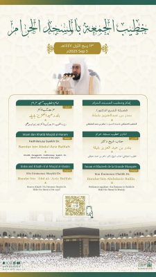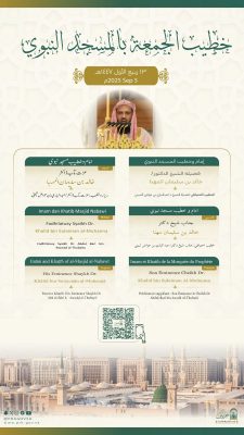 أعلنت رئاسة الشؤون الدينية بالمسجد الحرام والمسجد النبوي عن أسماء خطيبي وأئمة صلاة الجمعة في الحرمين الشريفين ليوم الجمعة الموافق 13 ربيع الأول 1447هـ، وذلك ضمن جدولها الدوري لتنظيم الإمامة والخطابة.
