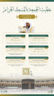 أعلنت رئاسة الشؤون الدينية بالمسجد الحرام والمسجد النبوي، عن أسماء خطيبي وأئمة صلاة الجمعة في الحرمين الشريفين ليوم الجمعة الموافق 20 ربيع الأول 1447هـ وذلك ضمن جدولها الدوري لتنظيم الإمامة والخطابة.