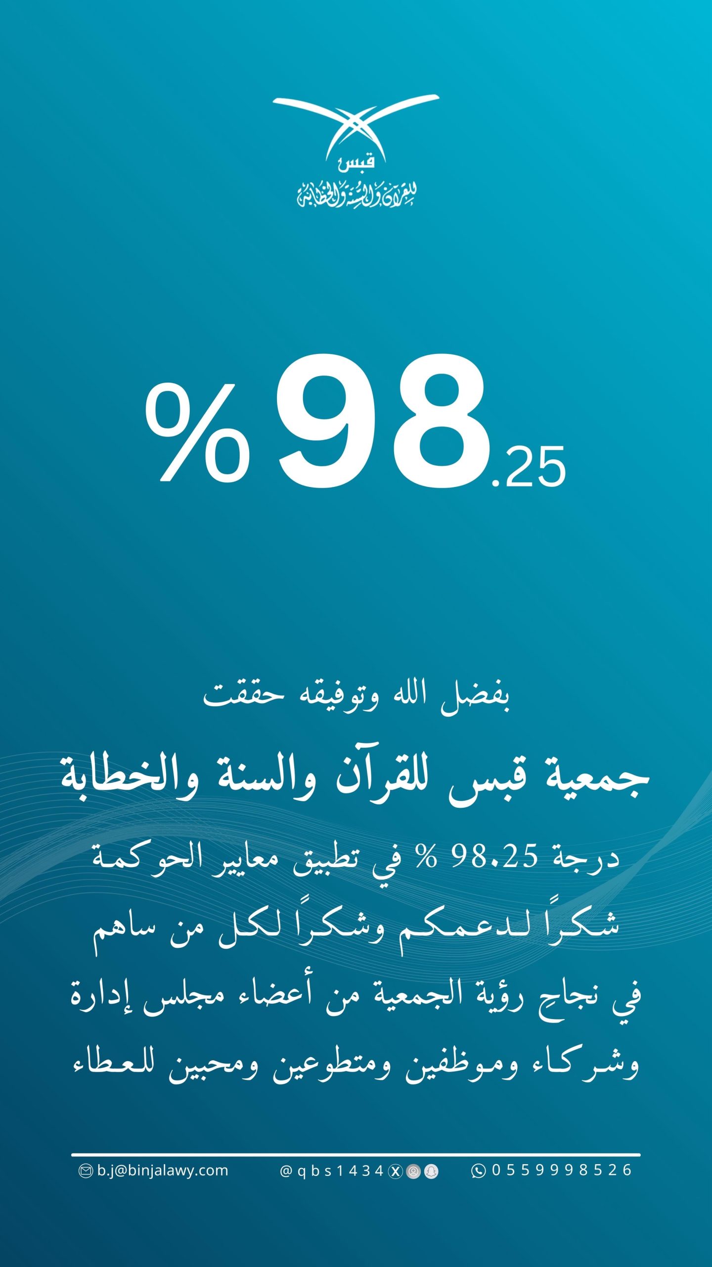 حققت جمعية قبس للقرآن والسنة والخطابة إنجازًا نوعيًا بحصولها على نسبة 98.25% في تقييم الحوكمة الصادر عن المركز الوطني لتنمية القطاع غير الربحي لعام 2025م، لتواصل مسيرتها في تعزيز الشفافية والكفاءة والالتزام المؤسسي.